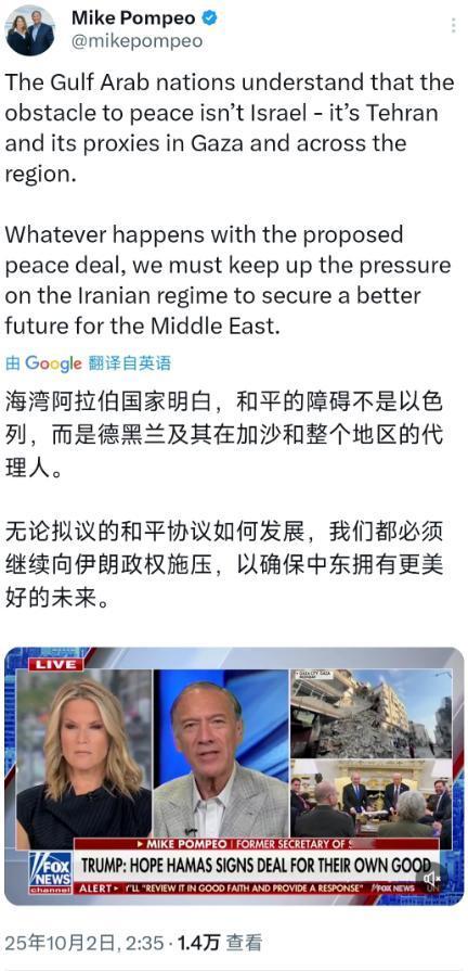 美国前国务卿蓬佩奥10月2日发文写道:“海湾阿拉伯国家明白,和平的障碍不是以色列,而是德黑兰及其在加沙和整个地区的代理人。无论拟议的和平协议如何发展,我们都必须继续向伊朗政权施压,以确保中东拥有更美好的未来。” 这话听得人真是火大,纯粹是睁眼说瞎话,把黑白彻底颠倒了,也就仗着自己极端亲以色列的立场,敢这么罔顾事实地胡扯。 先不说别的,中东和平的最大绊脚石到底是谁,稍微懂点事儿的人都门儿清。以色列在巴勒斯坦那片土地上干的事儿,可不是一句两句话能说清的糟心事。 这么多年来,以色列靠着武力侵占巴勒斯坦领土,约旦河西岸的定居点建了一个又一个,联合国都多少次通过决议说这些定居点是非法的了,以色列压根儿不当回事儿,该建还建,把巴勒斯坦人的生存空间挤得越来越小。 加沙地带更别提了,被以色列封得严严实实,水、电、粮食、药品哪样都缺,老百姓连基本的生活都保障不了,这才会有冲突不断升级。就这些明摆着的恶行,蓬佩奥作为前国务卿能不知道?他就是故意装瞎,心里只想着给以色列撑腰,连最基本的事实都能抛到脑后。 再看看他提的那些海湾国家,真像他说的那样把伊朗当敌人、认可以色列?这纯属自欺欺人。蓬佩奥嘴里的“拟议的和平协议”,说白了就是当年特朗普政府推的“亚伯拉罕协议”那一套,2020年的时候美国逼着阿联酋、巴林这些海湾国家跟以色列建交,表面上搞关系正常化,实际上全是美国霸权压出来的结果。 海湾国家的安全靠美国罩着,经济上也得看美国脸色,美国要是不高兴了,断了军售、搞点经济制裁,谁能顶得住?可就算签了协议,这些国家心里门儿清着呢,压根儿不是真心认同那套所谓的“和平方案”。 就说沙特,2023年跟伊朗复交之后,两国关系越走越近,今年5月伊朗外长去沙特访问,双方还专门强调要一起应对地区挑战,特别是巴勒斯坦问题,都一致谴责以色列滥用武力。 卡塔尔和阿联酋也一样,之前跟伊朗有矛盾,现在不光恢复了外交关系,还在多哈开伊朗-阿拉伯世界对话峰会,摆明了要抱团。更关键的是,沙特、卡塔尔这些国家早就放话了,绝不允许以色列甚至美国在攻击伊朗的时候用他们的领空,这不明摆着不站美国和以色列那边嘛。 还有阿曼,一直低调当中间人,之前美伊谈判靠它传话,这次以伊停火它也在幕后斡旋,这些行动哪点像把伊朗当“和平障碍”了?蓬佩奥还在这儿说海湾国家明白谁是敌人,纯属自己给自己编故事。 以色列才是在地区到处挑事的主儿,动不动就空袭叙利亚、黎巴嫩的目标,还总想着打伊朗的主意,也就是现在海湾国家和伊朗关系好了,敢拒绝开放领空,不然以色列的战机早就蹿到伊朗上空了。 而且伊朗这两年也在找和平出路,加入上合组织,跟阿拉伯国家修复关系,连伊核问题谈判,沙特、阿曼都在中间帮忙斡旋,这哪点像破坏和平的样子? 蓬佩奥这么颠倒黑白,根本不是为了中东的未来,就是为了给以色列撑腰,顺便帮美国的中东战略当枪使。美国在中东最看重的就是石油利益和霸权地位,中东的石油储量占全球六成,以前石油交易都用美元结算,美国靠这个赚大钱、说了算。 可伊朗这些年总想摆脱美国控制,甚至琢磨着用其他货币做石油交易,这直接戳了美国的痛处。而且美国想战略东移,就得先稳住中东,把伊朗这个“障碍”扫除,这样才能牢牢抓着石油控制权,还能遏制其他新兴国家。 以色列刚好是美国在中东的“钉子户”,帮以色列打压伊朗,既能让以色列替美国盯着中东,又能除掉自己的眼中钉,这算盘打得噼啪响。蓬佩奥当年当国务卿的时候就干过不少这事儿,退出伊核协议、对伊朗搞极限施压,现在卸任了还接着吹号角,说白了就是拿以色列当幌子,实则为美国的霸权服务。 其实现在海湾国家心里比谁都清楚,跟着美国瞎转悠没好处。这两年中东的和解潮就是最好的证明,沙特和伊朗复交后,卡塔尔和巴林、阿联酋也握手言和了,叙利亚还回了阿盟,大家都在搞经济转型,沙特的“2030愿景”、卡塔尔的“2030愿景”,全是想着怎么发展民生、搞高科技,谁愿意整天跟着美国搞对抗? 之前迫于压力签了“亚伯拉罕协议”,现在都在悄悄跟伊朗缓和关系,波斯湾的海事安全还一起合作,就是因为大家明白,只有地区国家团结起来,才能挡住以色列的扩张,才能不被美国当棋子耍。 蓬佩奥还在这儿喊着要施压伊朗,简直是跟不上形势了。现在的中东早就不是美国说一不二的地方,沙特敢拒绝美国的石油增产要求,卡塔尔敢同时跟美国、伊朗保持沟通,这些国家都在学着自己做主。 说到底,中东的和平从来不是靠打压伊朗能换来的,关键是得让以色列停下侵占的脚步,还给巴勒斯坦人应有的家园和权利。蓬佩奥这种为了盟友、为了霸权就颠倒黑白的做法,只会让中东的矛盾更激化。 现在中东国家已经开始自己掌控命运了,蓬佩奥再怎么喊口号,也挡不住地区和解的大势,他那些瞎话,迟早得被事实狠狠打脸。