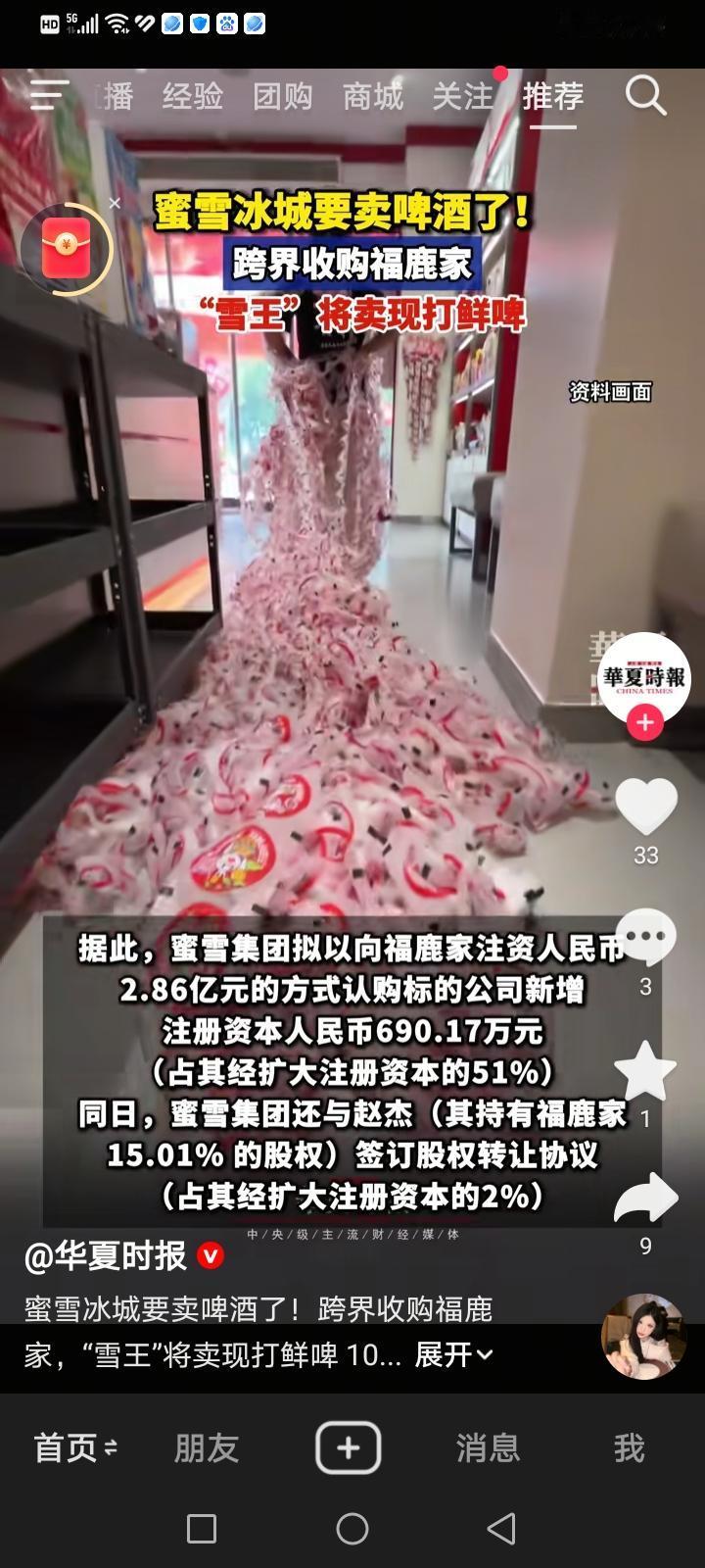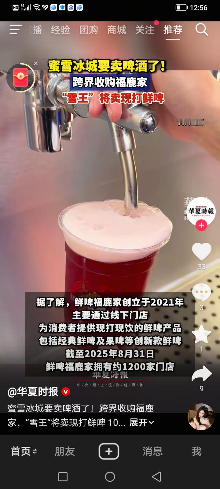蜜雪冰城要卖啤酒了。 2025年10月1日,蜜雪集团发布公告称,9月30日联交所交易时段后,其已与福鹿家(郑州)企业管理有限公司签订投资协议,将以约2.97亿元人民币的价格获得鲜啤福鹿家53%的股权。完成投资后,蜜雪集团的产品品类将从现制果饮、茶饮、冰淇淋和咖啡延伸至现打鲜啤。 鲜啤福鹿家创立于2021年,主要为消费者提供每500mL单价约6至10元的现打鲜啤产品,截至2025年8月31日,已在中国28个省、自治区和直辖市拥有约1200家门店。蜜雪冰城 河南蜜雪冰城 蜜雪饮品 蜜雪冰城店 蜜雪冰城广告牌 蜜雪总部在郑州