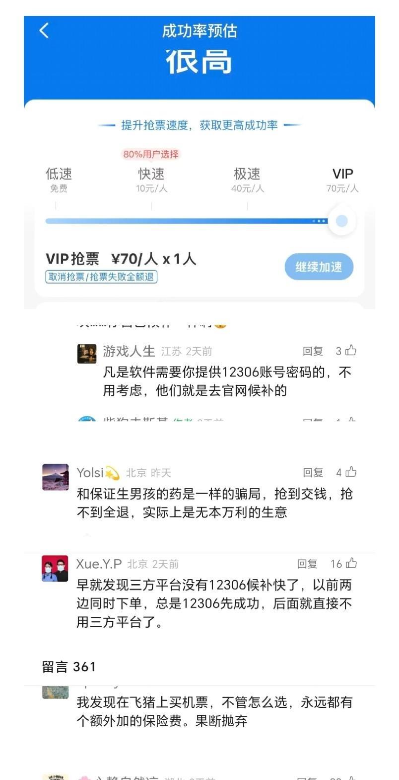 老家在哈尔滨的同事感慨说买个回家的火车票太难了,一下狠心多花了70块钱买了个加速包[捂脸]结果却被同事泼冷水:买火车票用加速包可以帮助抢票?官方都正式发声了:纯属骗人的噱头! 买加速包的同事自然不信,说自己多花了好几十, 明确写着”专人抢票、独享抢票通道"的!同事怎说你没看消保委做过实测,在9家购票平台购票,12306出票是最快的!另外8家号称提供有“加速包”服务的平台,都没有12306的抢票成功率和出票速度快!其中一家加了40块钱加速包的平台,比12306慢了将近一天一宿;另外一家加了48块钱的平台,比12306慢8小时! 而且这些所谓加价购买服务包的平台,还都存在搭售的情形!比如有的平台,稍不注意,就给你来个30块钱的保险费[捂脸] 所以关于加速包没用,12306官方也是经常发布声明,没有授权过任何第三方,加速没有用!就比如去年某平台为了吸引客流,打出了“全网免费退”的标语!结果12306直接回应:纯属营销炒作,误导消费者!