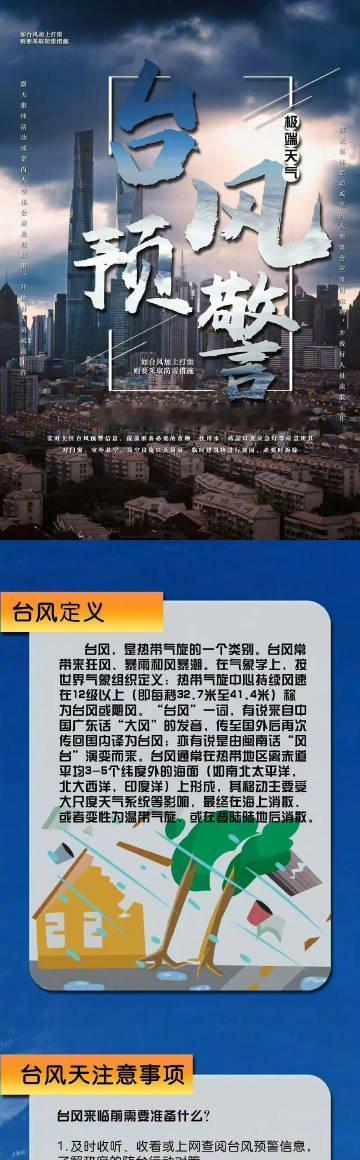【一图了解台风来临要做哪些准备】提前加固门窗、收好阳台杂物,不外出,远离广告牌、大树、沿海区域,停好车辆↓↓更多防御知识戳图了解,警惕台风带来的极端天气! via@中国消防