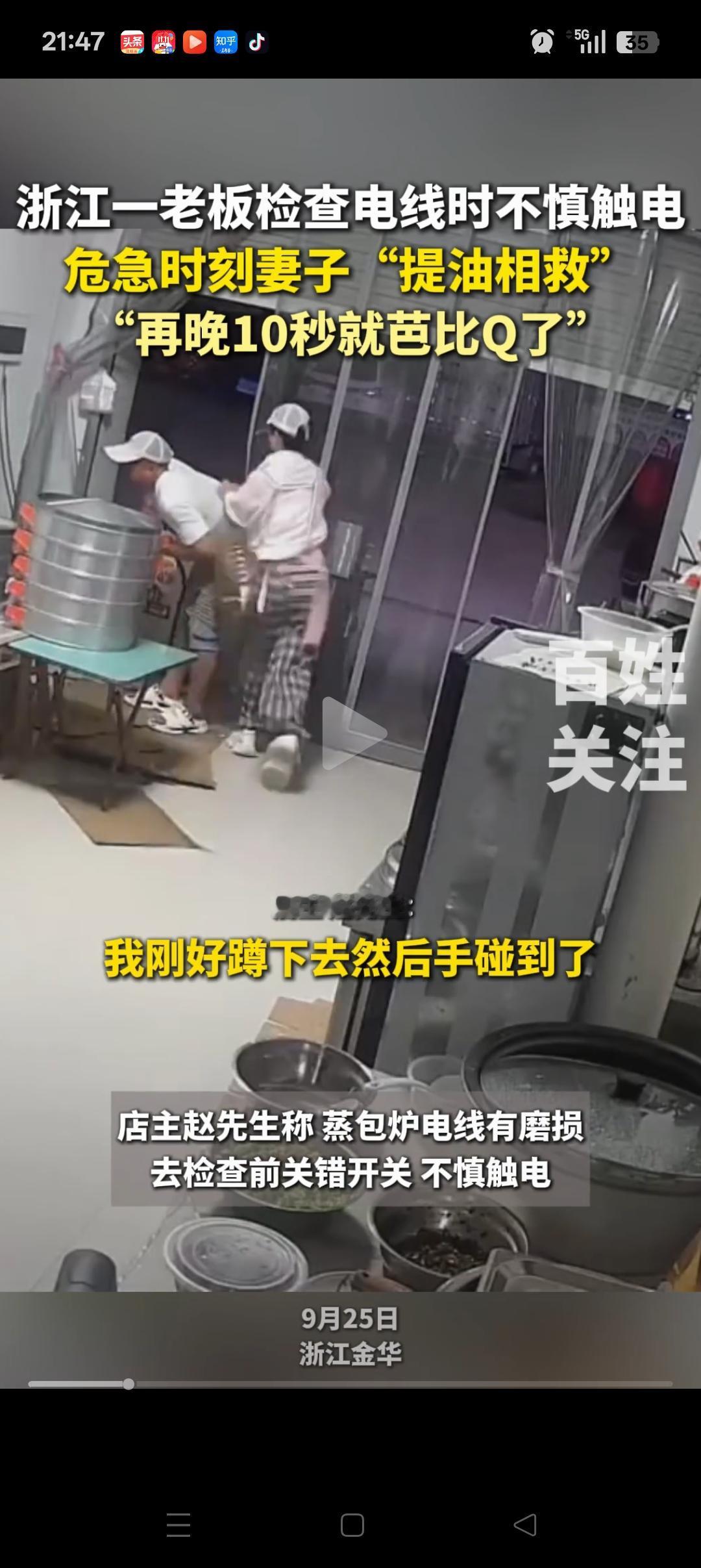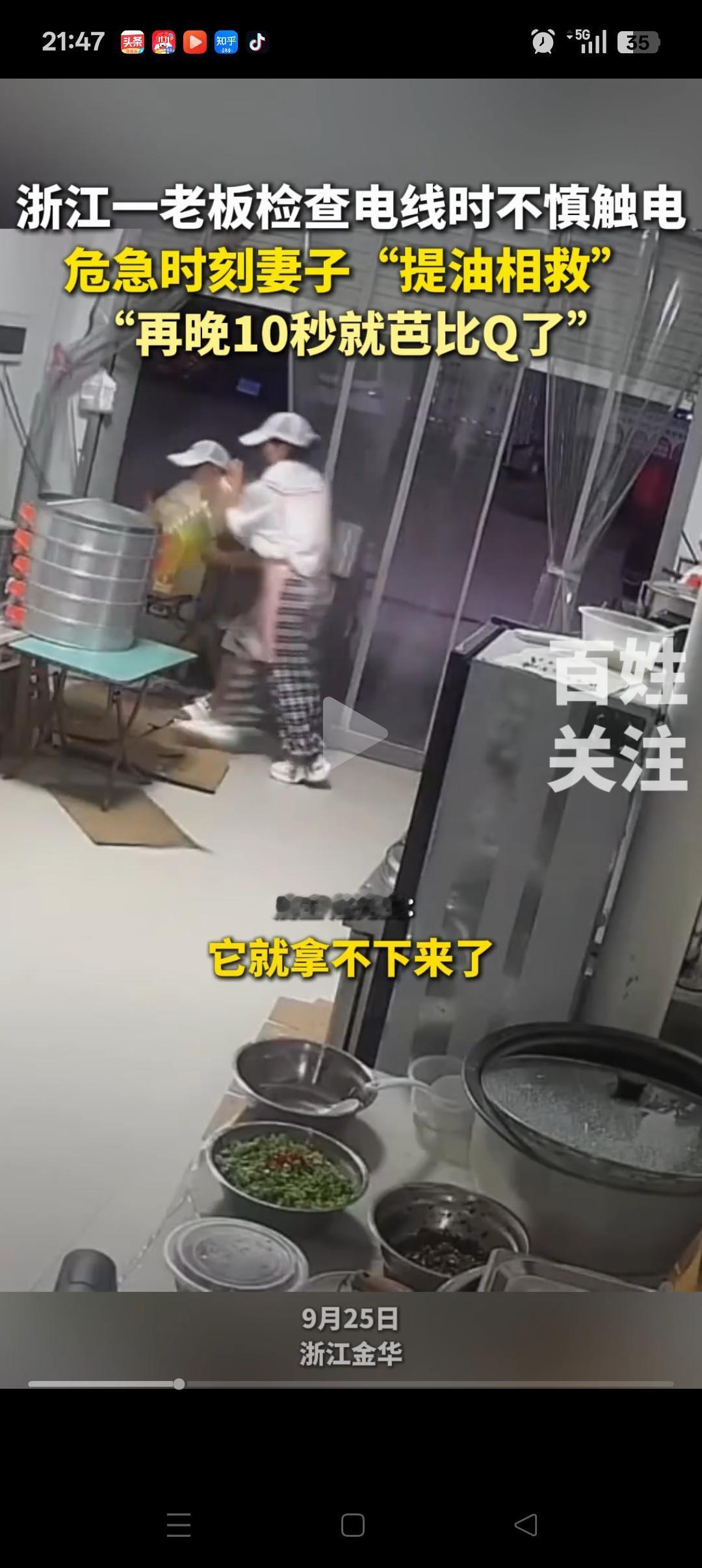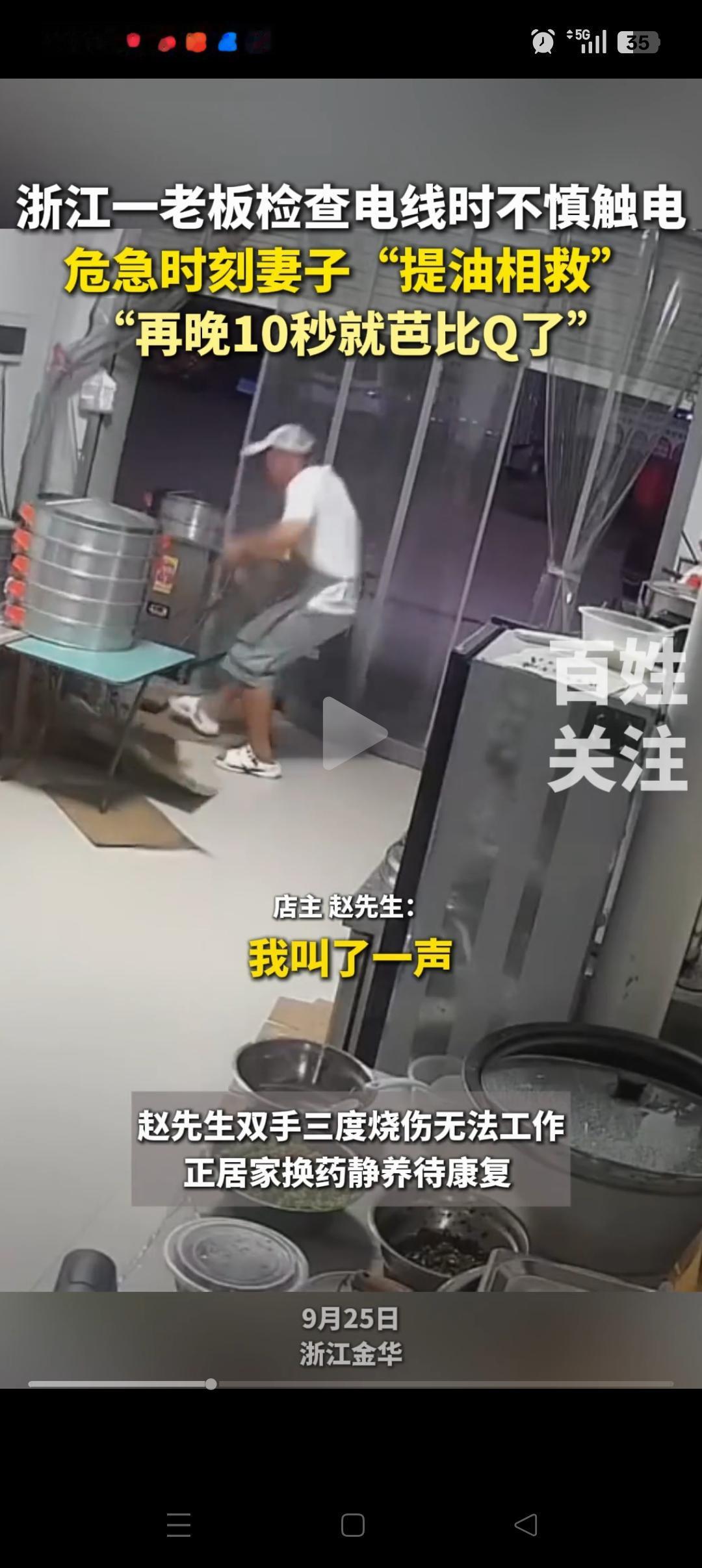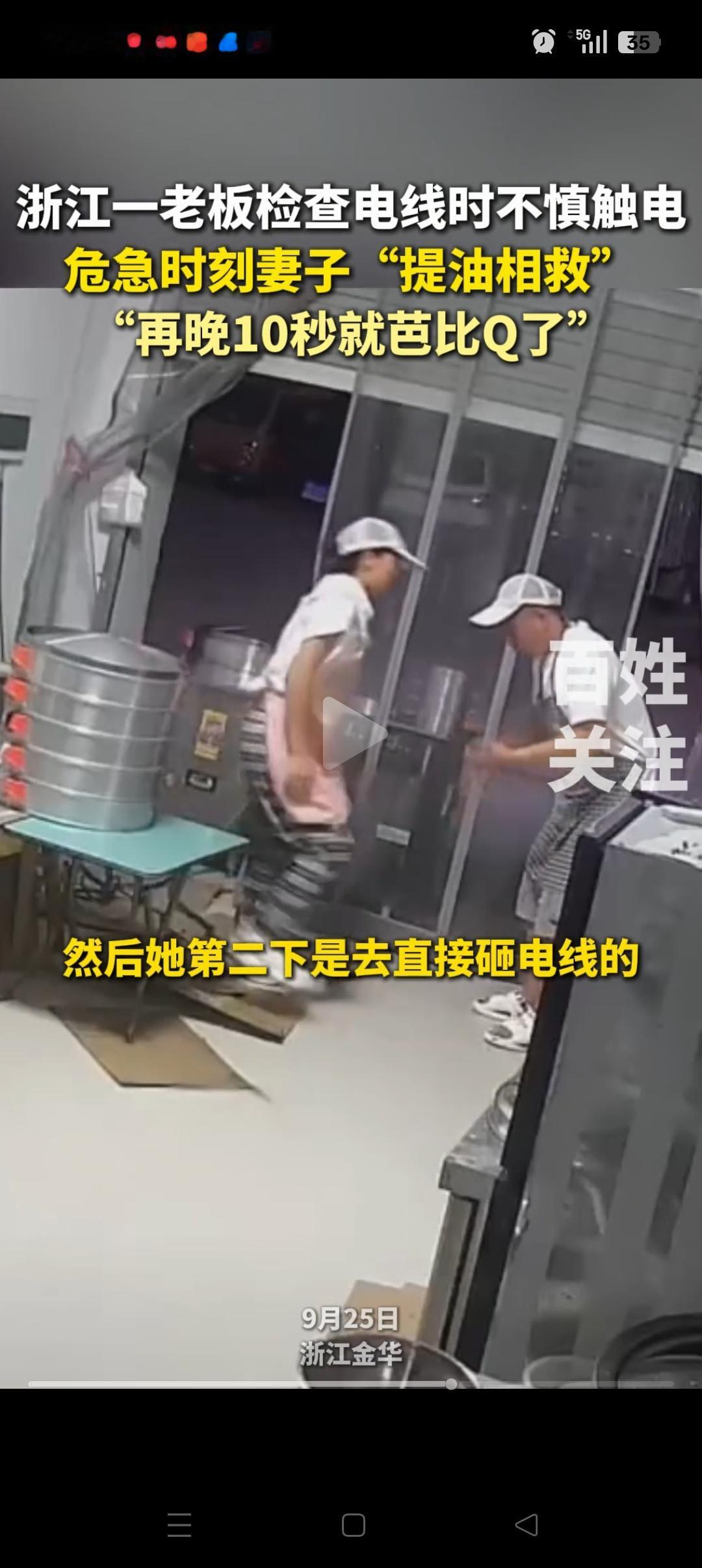 “太机智了”,浙江,一早餐店老板不慎触电,甩都甩不开。妻子非常机灵,没有直接用手去推,而是提了一桶油去撞老公,第一次失败后,直接用油把电线打掉了,但自己也摔倒了。 老板表示,是因为自己发现电线有磨损,去检查开关时,不小心触电的。 这个妻子确实很机智,值得所有人学习。如果是我老婆,听到我的呼救,估计会大喊:怎么办。一时半会很难找到好的解决办法,说不定两人都会触电[捂脸] 我敢说,90%的女人遇到这种情况都会乱了分寸,别说短短的几秒钟,也不乱喊,还能做出正确选择的,真是个好妻子[玫瑰][玫瑰]