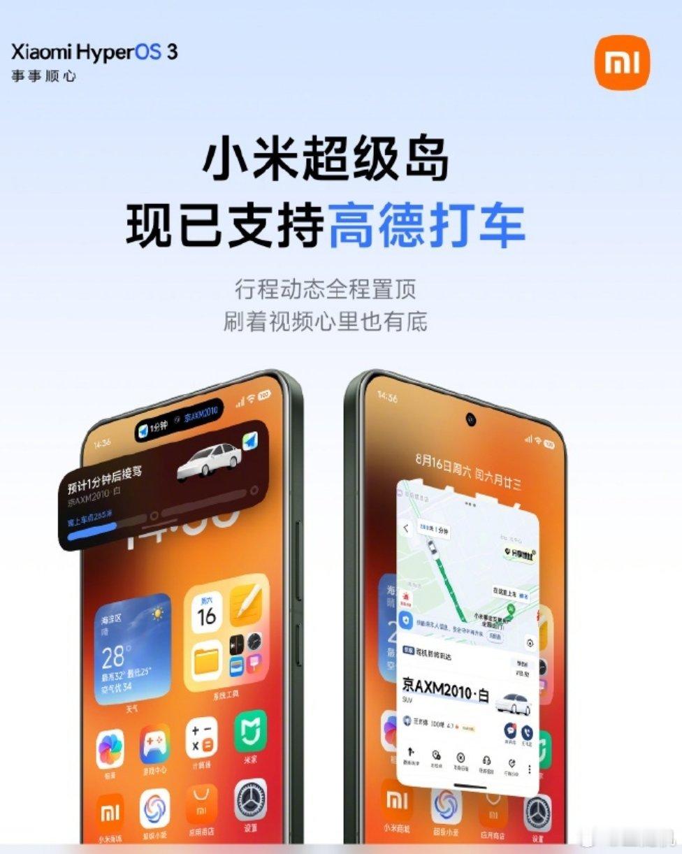不打开 App 就能看车牌号、到达时间,小米澎湃 OS 系统“超级岛”已支持高德打车,支持拖拽分享信息