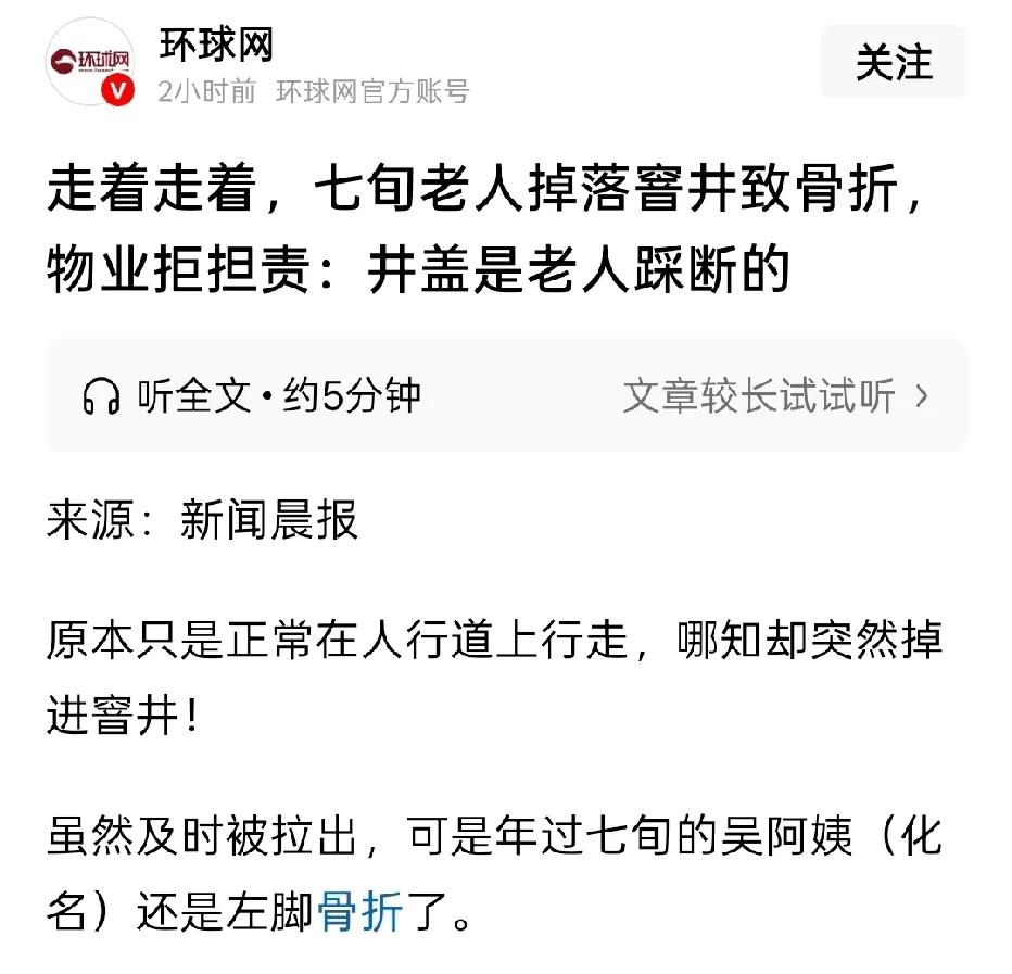 上海,70岁老人只顾和同伴聊天,没留意脚底的井盖没有盖子。她一脚跌落,经诊断,左足骨折,老人找物业赔偿。但物业不愿赔偿,还声称老人把井盖踩坏。双方无法达成一致,老人一气之下将物业告上法庭,法院这样判了。 据悉,70岁的吴阿姨(化名)跟几个同伴去公园散步。 当她们几人走到某个街口时,意外发生了。 吴阿姨只顾和身边的人聊天,突然,她脚下突然传来一阵失重感。 她没注意到路面一处窨井的井盖早已缺失,整个人顺着井口摔了下去。 伴随着同伴的惊慌失措,呼喊不绝,随后,有人帮忙打急救电话。 吴阿姨跌落在井中不断哀嚎,剧痛瞬间传遍左腿。 随后吴阿姨被送往医院,经检查确诊为左足骨折,不仅需要打石膏固定,后续还得长期休养,日常出行都成了难题。 伤愈期间,吴阿姨的家人找到负责管理该窨井某物业公司,表示窨井未盖窨井盖,导致她掉下去,希望对方承担医疗费、护理费等相关损失。 可物业的回应让她既气愤又寒心:我们的井盖质量没问题,说不定是你自己走路不看路,用力踩坏了井盖才掉下去的,这责任不在我们。 无论吴阿姨如何解释当时的情况,物业始终坚持自身无责,拒绝任何赔偿。还声称这是井盖施工方的责任,并不关系到他们物业管理公司。 几次协商下来,双方始终各执一词,矛盾毫无缓和的余地。 吴阿姨想到自己平白受了伤,还得自担费用,吴阿姨咬了咬牙,决定通过法律讨回公道。 她整理好医院诊断书、事故现场照片等证据,在家人的陪同下将涉事物业告上了法庭,要求对方赔偿各项损失共计3万余元。 法庭上,物业依旧辩称窨井日常维护到位,井盖损坏是吴阿姨踩踏所致,甚至提出老人年纪大,可能因自身行动不便导致摔倒。 但法院经调查发现,涉事窨井的管理责任明确归属该物业,且物业无法提供证据证明井盖损坏系吴阿姨造成,更未能举证自己尽到了定期检查、及时维修的管理义务。 最终,法院判决物业对吴阿姨的受伤承担主要责任,需赔偿其医疗费、误工费等共计3万9千余元。 《民法典》第1258条规定:在公共场所或者道路上挖掘、修缮安装地下设施等造成他人损害,施工人不能证明已经设置明显标志和采取安全措施的,应当承担侵权责任。窨井等地下设施造成他人损害,管理人不能证明尽到管理职责的,应当承担侵权责任。 物业公司作为涉案窨井的管理方,对窨井盖是否缺失、是否稳固等的安全性具有管理保障职责。 虽然物业公司主张窨井盖未缺失,其尽到了巡查义务,且因窨井盖存在质量问题,巡查时无法发现安全风险。 但法院认为,物业公司作为专业的物业管理单位,对窨井的巡查不应仅停留在表面查看。 根据其提供的巡查记录,巡查内容中有针对窨井是否稳固的检查项目,而物业公司未能证明其按照巡查要求尽到了相应的职责,未尽责查看窨井是否稳固,因此可以认定物业公司未尽到管理职责,应当承担侵权责任。 《民法典》第1198条规定:宾馆、商场、银行、车站、机场、体育场馆、娱乐场所等经营场所、公共场所的经营者、管理者或者群众性活动的组织者,未尽到安全保障义务,造成他人损害的,应当承担侵权责任。 物业公司作为事发街口窨井的管理人,对该公共场所的设施安全负有法定的安全保障义务,需主动防范和消除窨井无盖等可能危及行人安全的隐患。 其未及时发现并补充缺失的井盖,显然违反了这一义务,与吴阿姨跌落受伤的损害结果存在直接因果关系。 综上,法院判决某物业管理公司承担全部侵权责任。 对此,你怎么看?