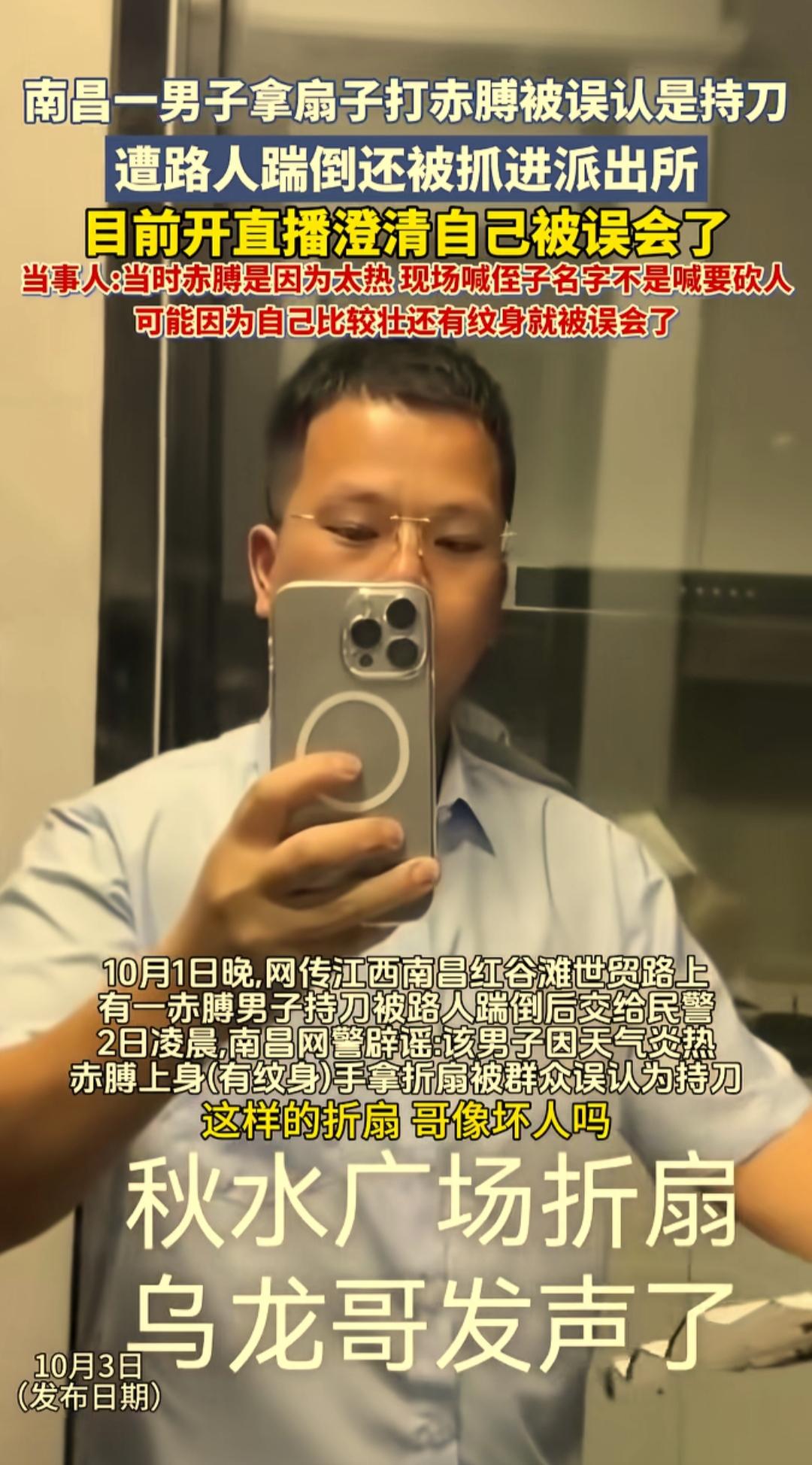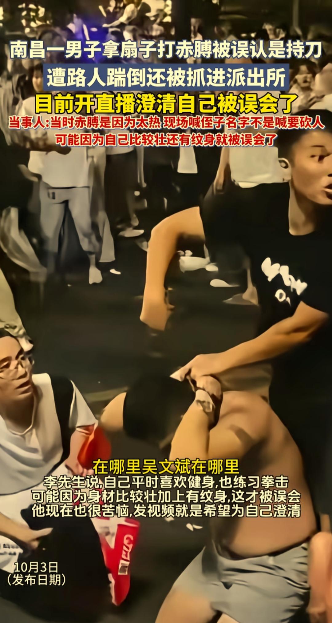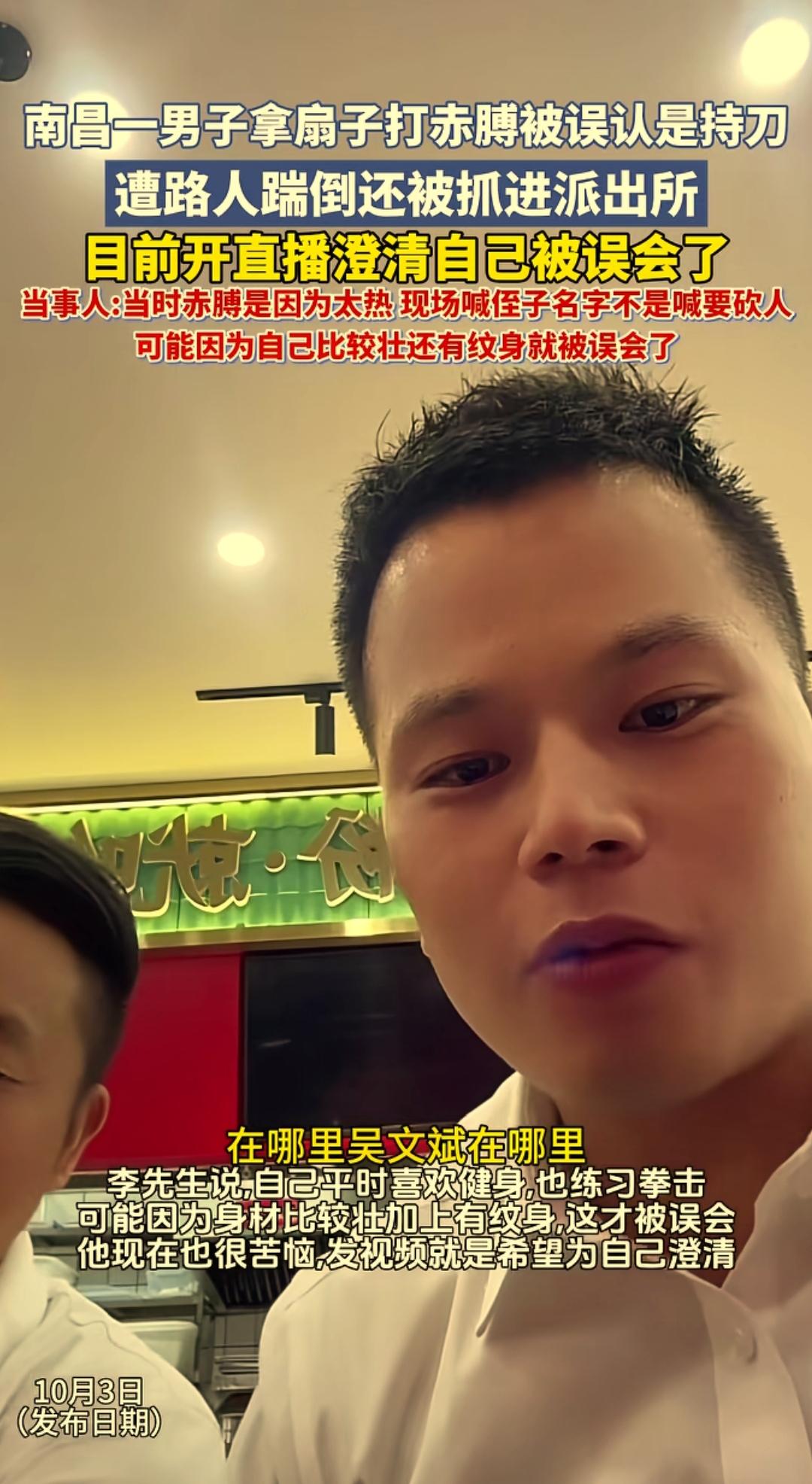 10月3日南昌折扇哥李先生发视频澄清自己被误会,他对此事感到很困惑,到现在都是蒙的。 他平时喜欢健身和拳击,身材比较壮硕,胳膊上有个条形码的纹身。 他拿出折扇,说哥像坏人吗?他当时喊的时候也是叫自己外甥的名字,外甥叫吴文斌。 他喊到:吴文斌在哪里吴文斌在哪里,不是说我要宰人我要宰人。 这起乌龙发生在10月1日,南昌红谷滩区世贸路附近,31岁的李先生因天气炎热赤膊上身,手里拿把折扇在街上行走。 当时他因与家人观看烟花表演后外甥走失,他大声呼喊寻找,周围群众以为他手里拿的是把刀具。 随后一名红衣青年上前夺走扇子,另外一名黑衣青年将他踹倒,众人合力一起将他控制住交给了民警。 10月2日,南昌网警发布了通报辟谣,澄清了男子持刀的消息实为误会,该男子手里拿的是一把折扇。