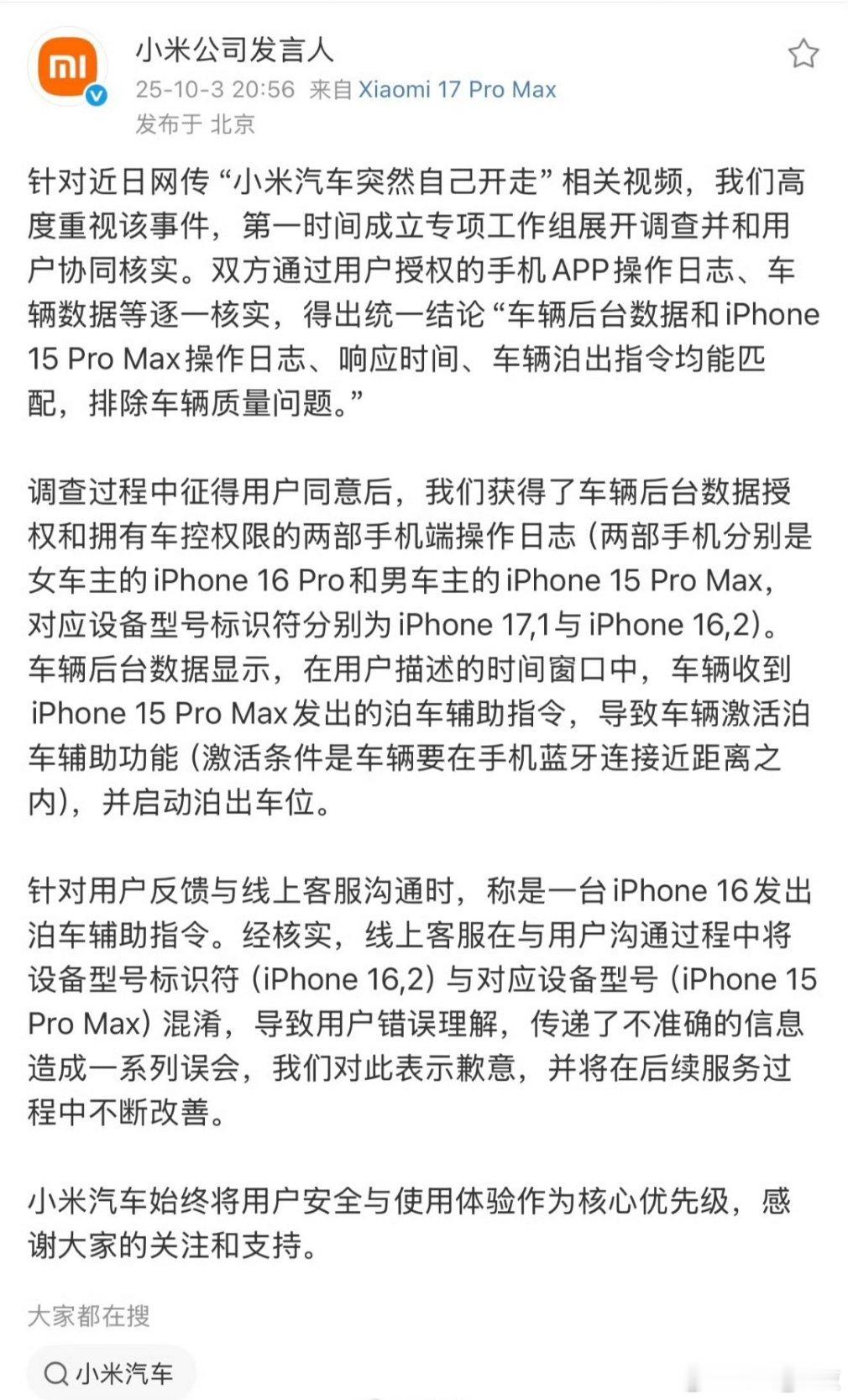 小米公司发言人回应事实已查清,是因车主误操作与车辆质量无关。