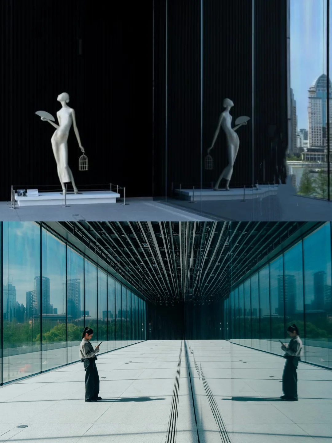 1️⃣到美术馆,先去2F&3F的镜厅,好有艺术感,可以对称构图,现在3F还有《东方少女》雕塑,是打卡jue佳机位