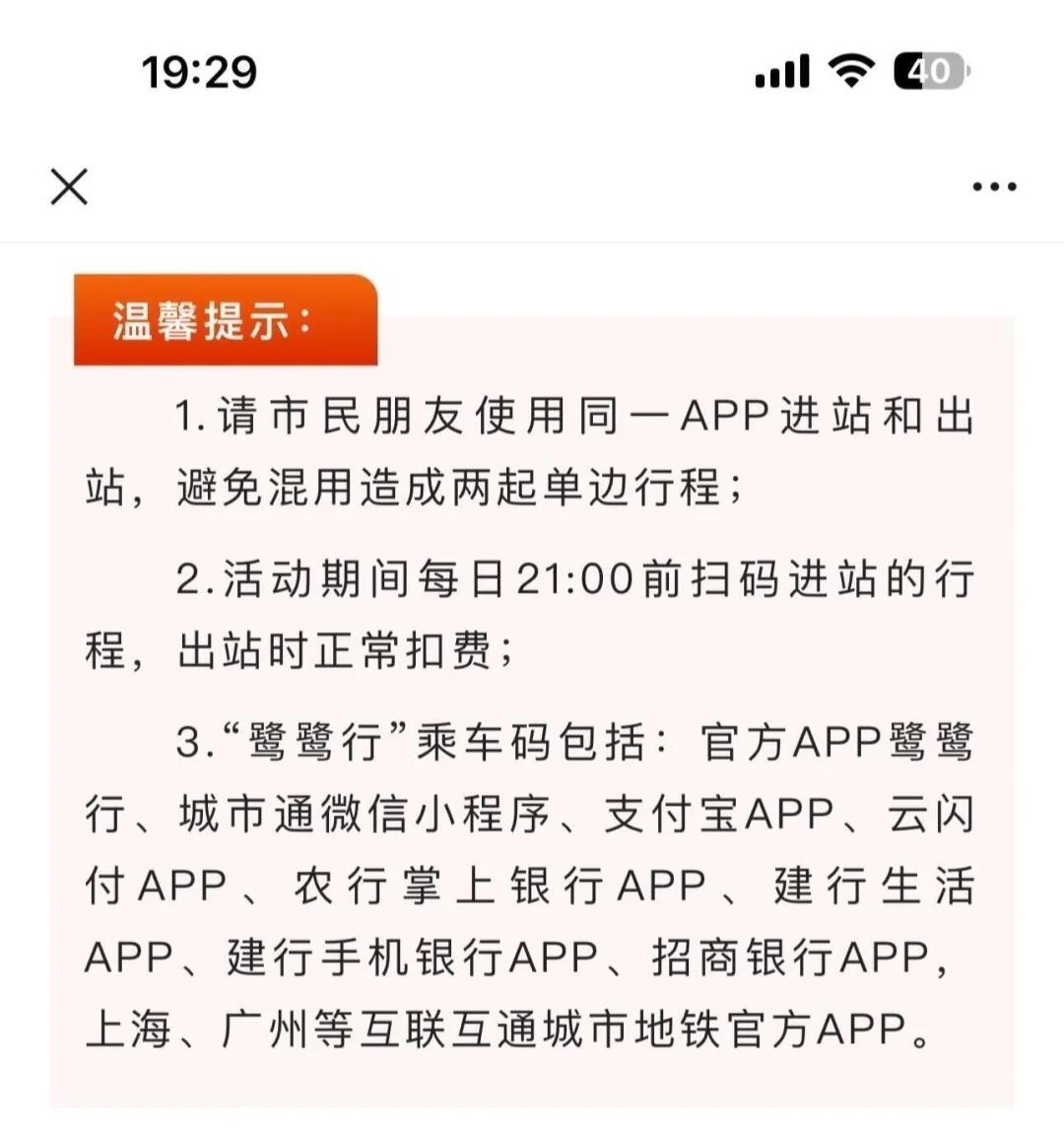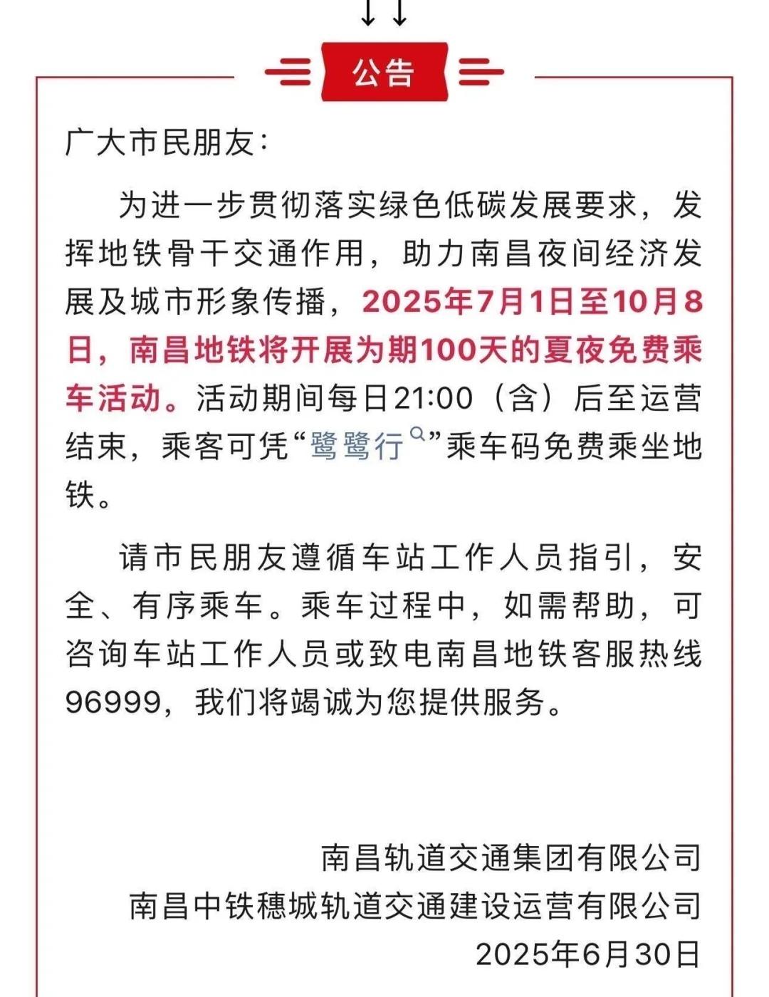 南昌地铁又免费了!!为期100天👏👏 ||国庆来南昌旅游的小伙伴省钱了,7月1日开始, 为期100天21:00(含)至运营结束南昌地铁 可免费乘坐啦! 免费乘车时间:2025年7月1日至10月8日, 活动期间每日21:00(含)后至运营结束。 乘客可凭“鹭鹭行”乘车码免费乘地铁。 [鼓掌][鼓掌][鼓掌]温馨提示: [一]请市民朋友使用同一APP进站和出站, 避免混用造成两起单边行程; [二]活动期间每日21:00前扫码进站的行程, 出站时正常扣费; [三]“鹭鹭行”乘车码包括:官方APP鹭鹭行、城市通微信小程序、支付宝APP、云闪付APP、农行掌上银行APP、建行生活APP、建行手机银行APP、招商银行APP、上海、广州等互联互通城市地铁官方APP。 - 地铁游玩路线: 抵达南昌站(坐地铁2号线)➡️八一广场➡️江西省美术馆➡️武商MALL(南昌字墙打卡点)➡️八一起义纪念馆(坐地铁1号线)➡️万寿宫➡️滕王阁(新洲文化广场)➡️大士院➡️ 南昌之星摩天轮 ➡️返程 -