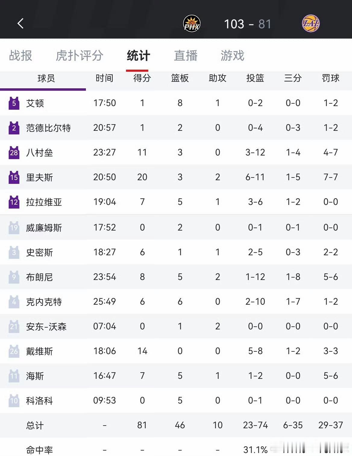 “续约雷迪克=放弃争冠”;“湖人不怕多付工资,但怕浪费东契奇黄金期”。一场季前赛打穿了湖人的底裤…… 顿宝:花大力气引进的内线艾顿上场18分钟,两分2中0,罚球2中1,仅得1分8板2助1断2帽。 湖人活宝:布朗尼12投1中,8分5板。 这两个人连CBA都没人要,湖人真是捡到宝了。