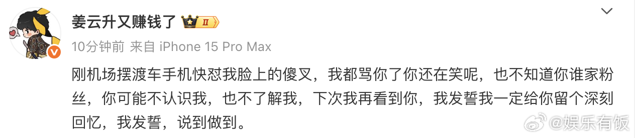 姜云升怒斥机场代拍姜云升被代拍怼脸拍 发文就机场遭遇代拍怼脸拍摄一事作出回应,他表示,在机场摆渡车上,有代拍用手机几乎怼到自己脸上拍摄,即便自己进行了斥责,对方仍在笑,且自己并不清楚对方是哪家粉丝。姜云升称对方可能不认识、不了解自己,同时警告对方 “下次我再看到你,我发誓我一定给你留个深刻回忆,我发誓,说到做到”。