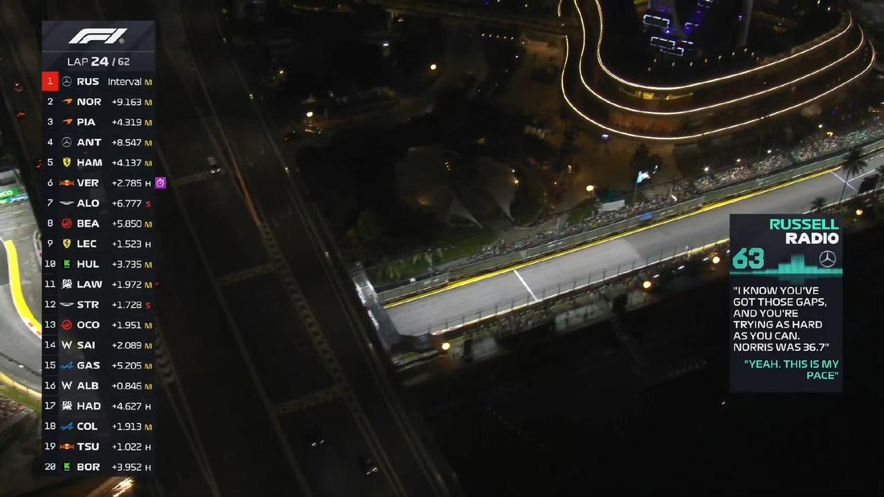 心机婊!第18圈,迈凯伦假装准备给诺里斯换胎 还想骗维斯塔潘进站换胎。冠军车队居然玩这样的招数…… 第24圈,维斯塔潘进站后,诺里斯正在不断追近拉塞尔。