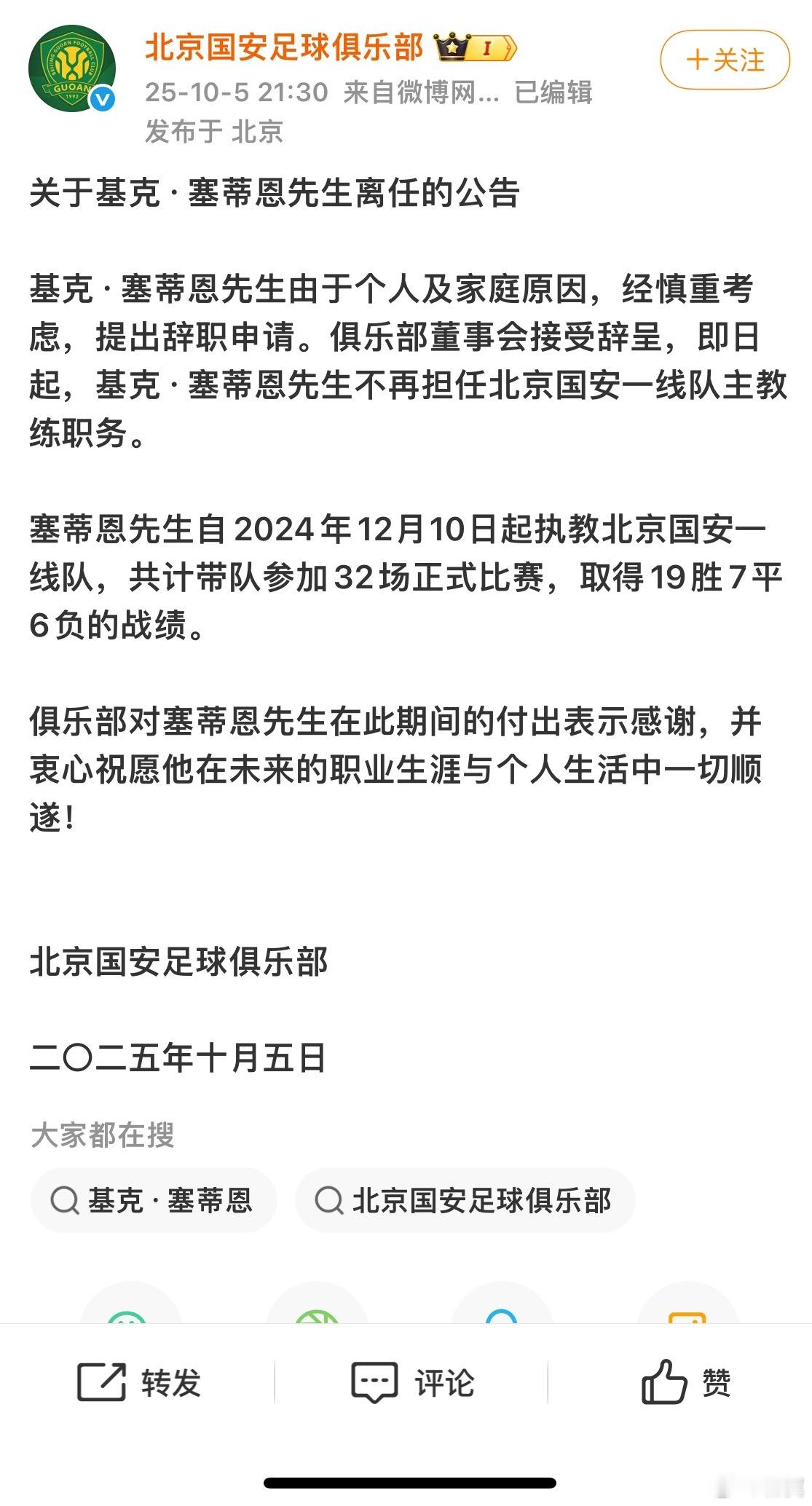 塞蒂恩下课 赛季初雄心壮志的塞先生下课了。半程冠军下半赛季很挣扎,近6场输了4场。北京国安
