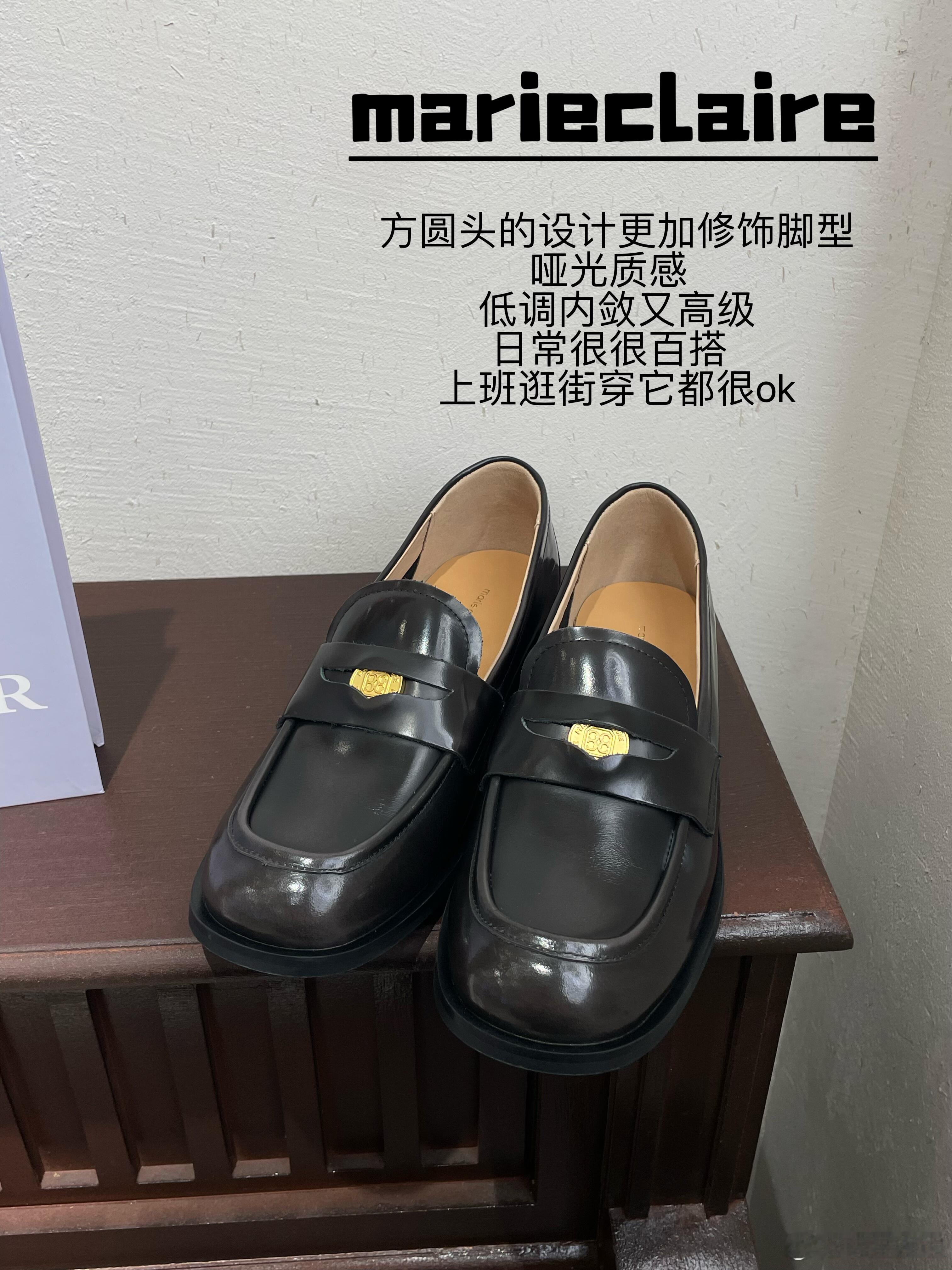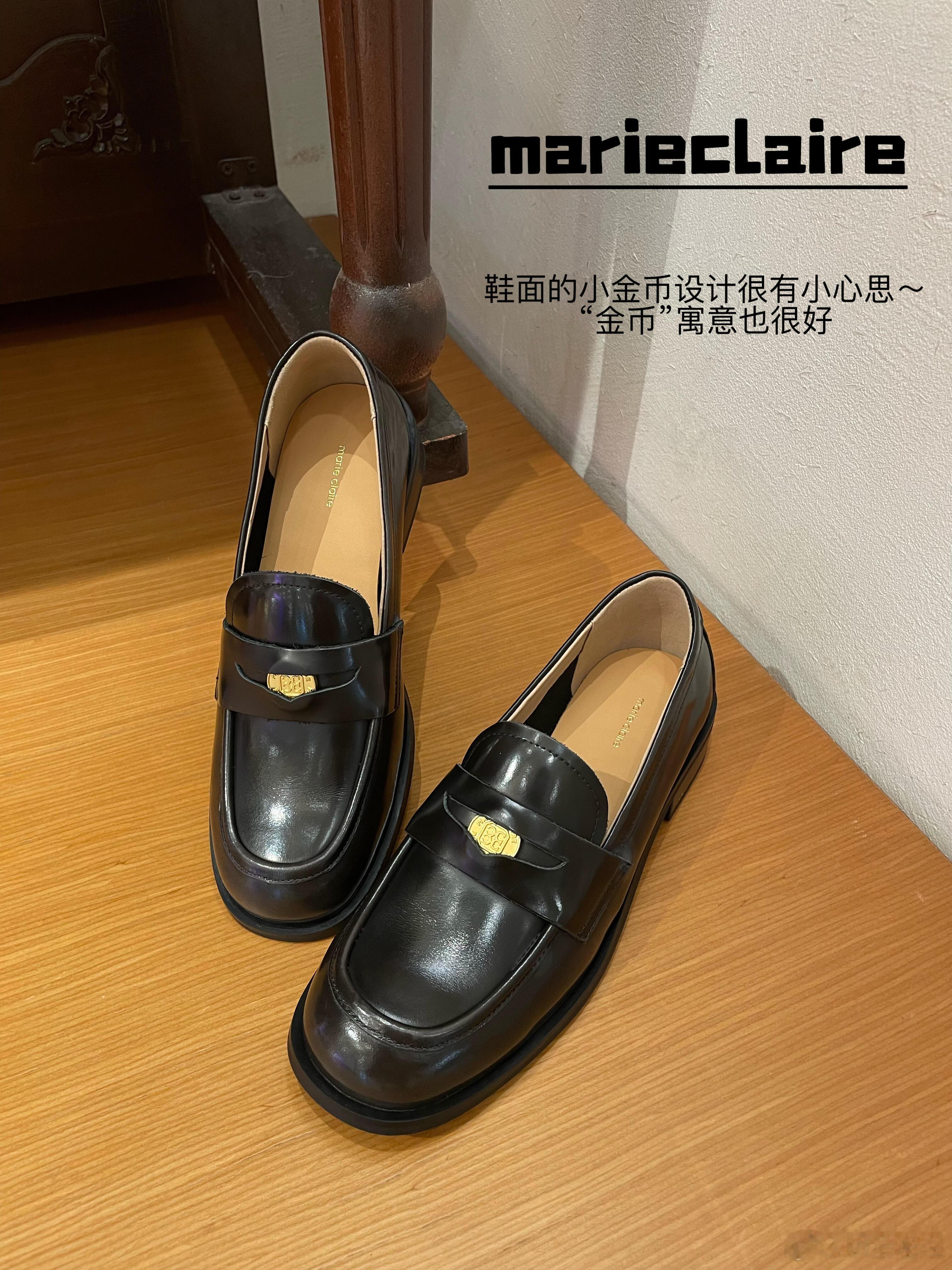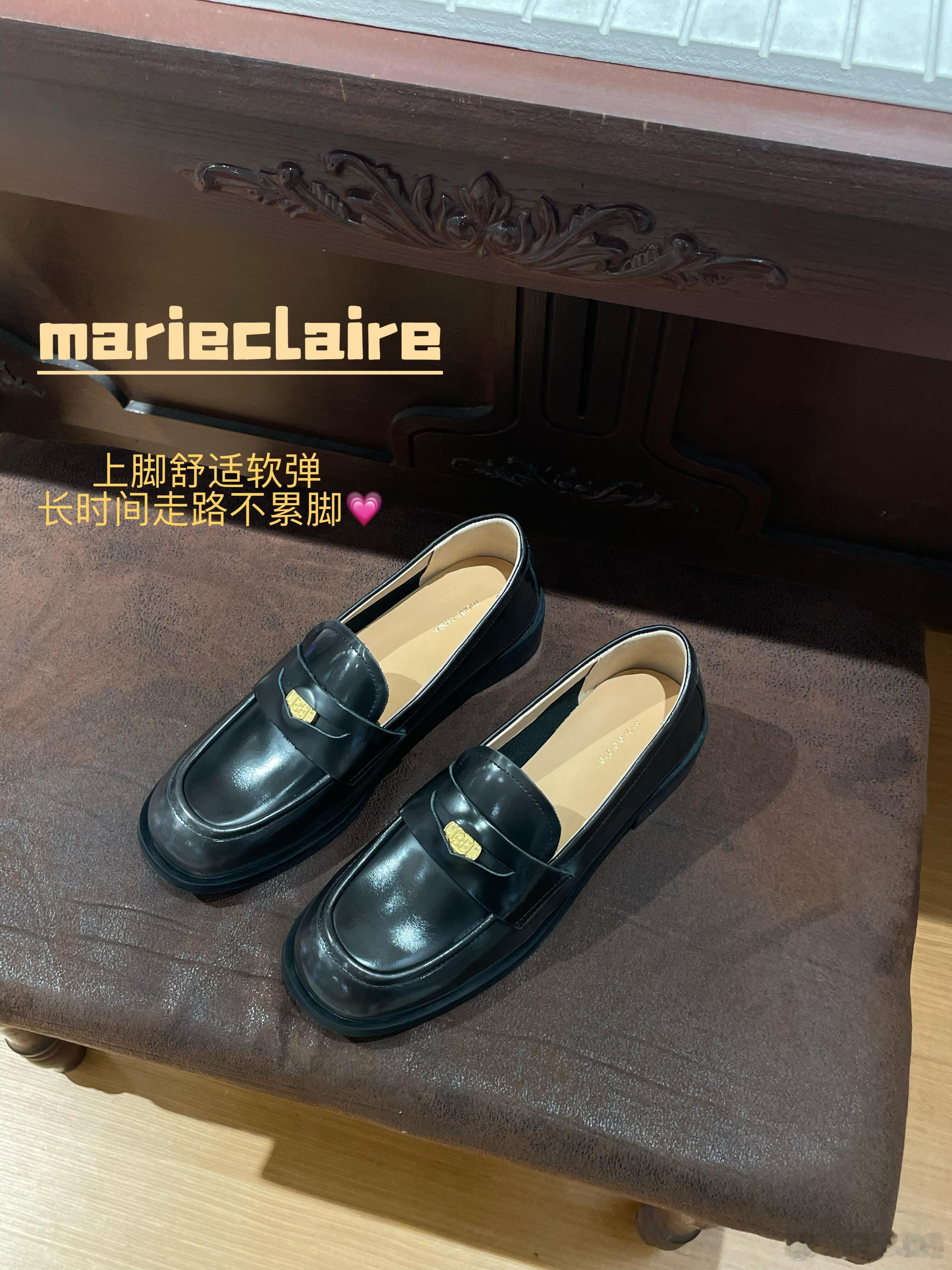 这双来自玛丽珍(Marie Claire)的黑色乐福鞋,是经典与现代舒适理念的完美结合。鞋身采用光泽感十足的优质牛皮革,经典的圆润方头设计优雅而不失时尚感。最大的亮点是鞋面的金属扣袢,上面镶嵌着精致的金色“MC”品牌徽标,瞬间提升了整体的精致度与辨识度。