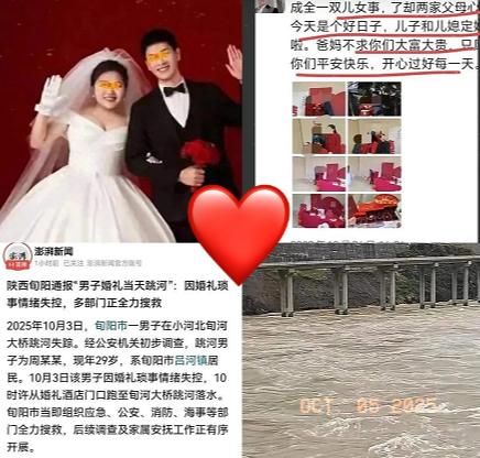 在这本应喜气洋洋的大喜日子,新郎竟做出令人吃惊的举动,纵身跳入河水中。 官方通报“婚礼琐事”,全网追问真相。 三个问题,揭开这场悲剧背后的隐痛。 一问:究竟是什么琐事,能压垮一个成年人的求生欲? 据官方通报,29岁新郎周某某于婚礼当日,因“婚礼琐事致使情绪失控”,毅然从旬河大桥纵身一跃,投身于滔滔河水之中。尽管网络流传“新娘临时加价2万下车费”,但相关部门明确回应:“跟彩礼没有关系”。 二问:为什么谣言总比真相跑得快? 事件发生后,“母亲跟着跳河”“彩礼谈崩”等说法疯狂传播。尽管官方多次辟谣,但标签早已贴在新娘身上。她没等来婚礼,却等来了全网审判。谣言杀人不用刀,却能让活着的人终生流血。 三问:婚礼到底是爱情的见证,还是面子的较量? 新郎父亲用“种种原因”四个字道尽无奈。或许琐事只是导火索,背后是长期积压的焦虑,从彩礼到婚宴,每个环节都在比较,每个细节都在烧钱。婚姻的本质是爱,不是排场。 这场悲剧撕开了现代婚恋的隐痛,把婚姻当考场,用物质衡量感情。 希望所有人记住: 婚礼只是一天的热闹,婚姻才是一生的修行。 少点计较,多点包容,别让爱情死在虚荣里。 你怎么看这场悲剧? 你身边有因彩礼、婚俗闹翻的例子吗? 评论区聊聊你的观点!