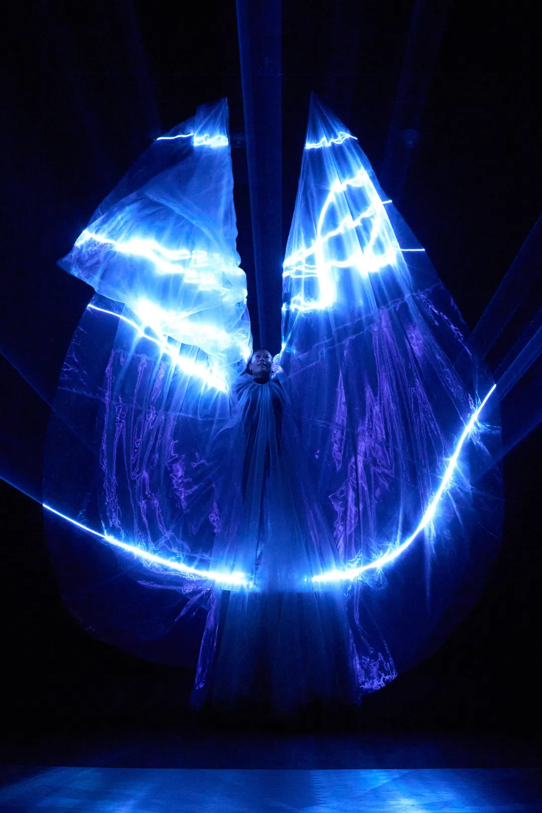 必看亮点来咯✨ 一件由 1.25 亿活体生物发光藻体 Pyrocystis lunula 构成的「生命之裙」,在暗场中散发幽蓝光芒,宛如星海微动,这哪是裙子,分明是艺术品!