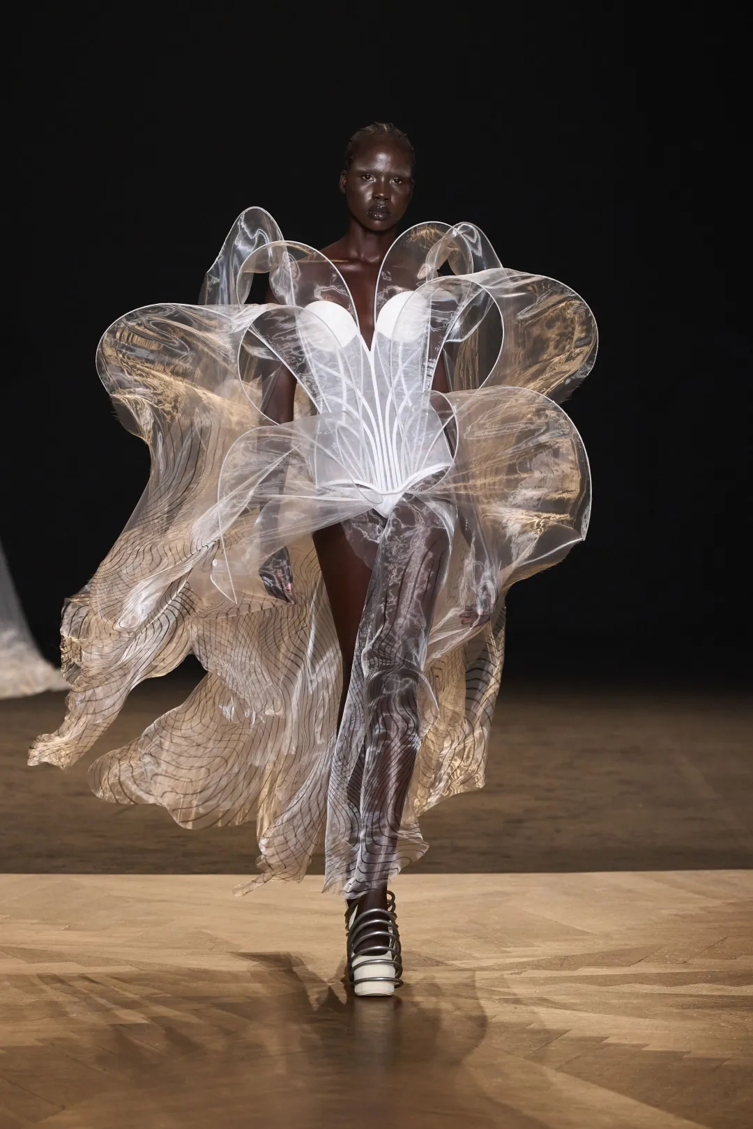 Iris Van Herpen 这次还和日本生物技术公司 Spiber 合作,用 Brewed Protein™材料打造婚礼造型。透明欧根纱搭配激光切割的纤维骨架,再缝上白色珊瑚状花瓣,拖尾轻盈通透,简直是梦幻婚礼的不二之选👰