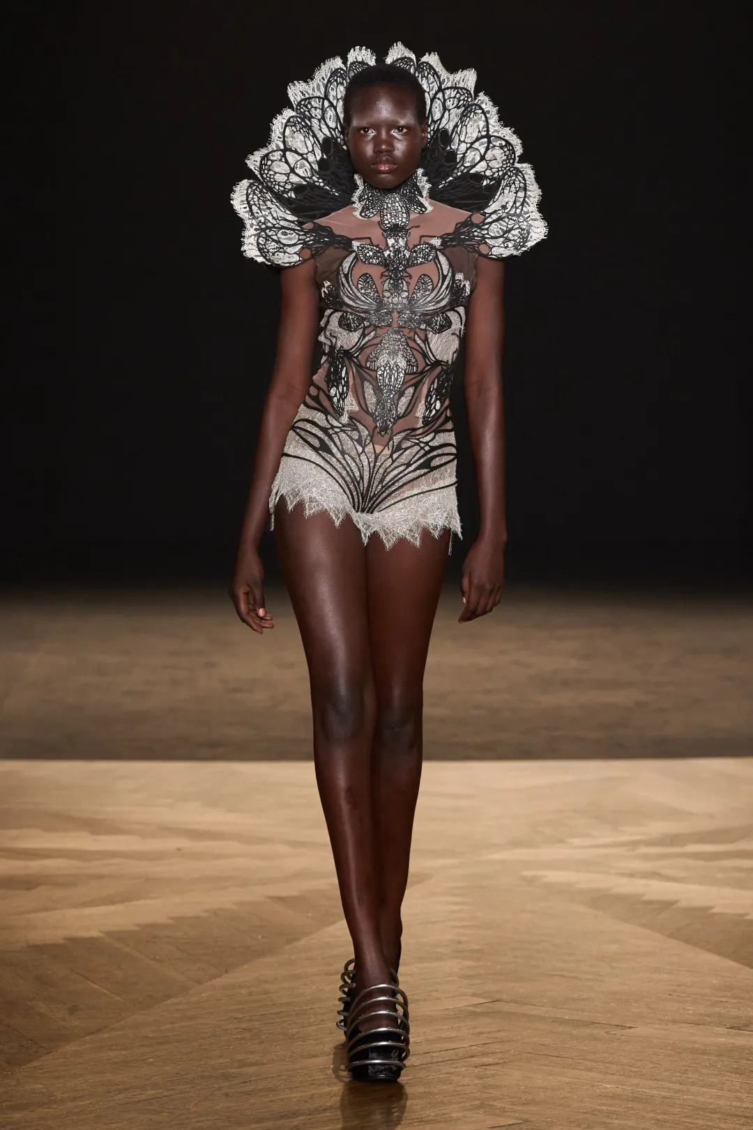 整个系列就像把神秘海洋搬上了 T 台🧜♀️ 模特们身上的礼服,有的如藻类轻轻包裹身体,随着步伐闪烁微光;有的用轻盈空气感织物打造,像是悬浮在空中,挑战着地心引力;还有如外星人骨架般夸张起伏的设计,每一步都走出了未来感。