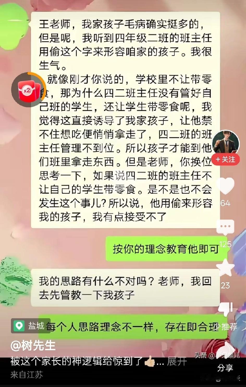 这名老师真是厉害,对于遇到的奇葩家长,他既没有争辩,也没有解释,而是顺着这位家长的意思进行了回复。 班主任禁止班级所有同学带零食到学校来吃,一位同学带零食进教室被老师抓了个正着,老师批评学生,不要偷偷摸摸带零食到学校来吃,这位孩子的家长得知之后非常的气愤。他认为,老师用偷来形容他的孩子太过分了,他完全接受不了。老师对于这位家长的抗议只是说了一句,按你教育理念即可,存在即合理,只要按照你的教育逻辑来就可以了,并没有为教师的管理行为做过多的辩解。因为说的越多,错就越多。所以老师没直接与这位家长形成正面冲突,而是充分尊重了这位家长的异议。不给自己惹事,反正核心就一点,家长说的都是对的,按照家长的教育教育就可。