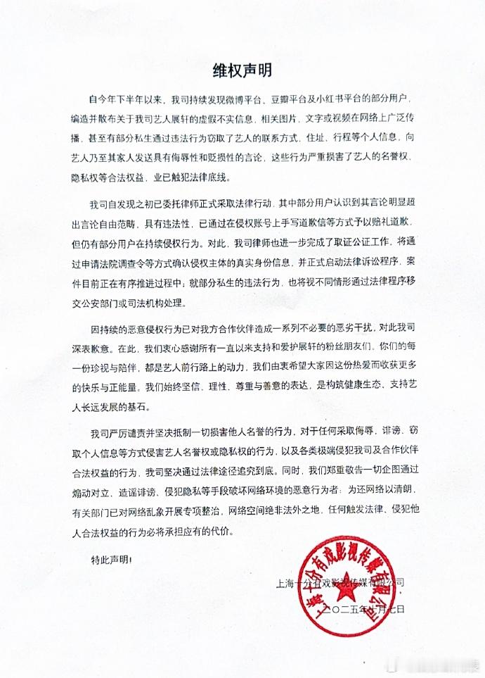 展轩方取证展轩方维权声明 ​​​​7日,展轩工作室发布维权声明,抵制私生等侵权行为,律师已完成公证取证工作,正式启动法律诉讼程序,对侵权行为追责到底。 ​​​