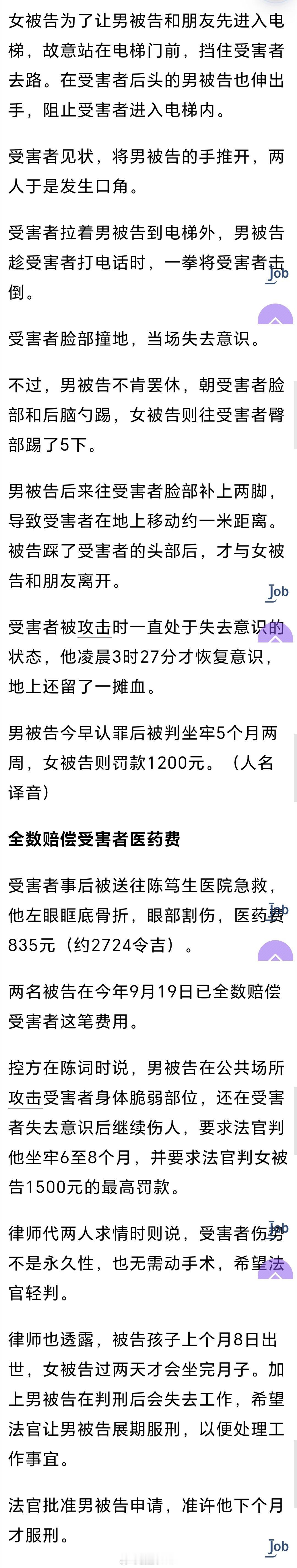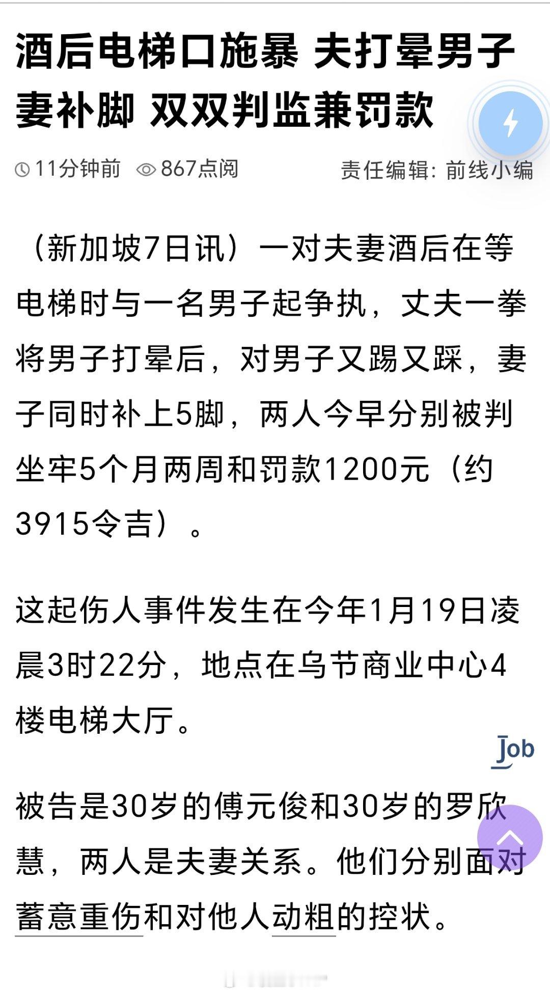 新加坡夫妻共同施暴齐判监罚款新加坡夫妻同心,齐齐判监:酒后电梯口施暴、夫打晕男