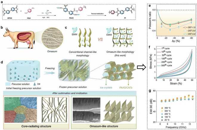 ▲聚酰亚胺/碳纳米管气凝胶的结构设计与性能:(a)聚酰亚胺的合成路线;(b)牛肚微观形貌示意图;(c)多孔电磁屏蔽材料常规孔道形貌和本工作中提出的类牛肚状形貌的对比;(d)聚酰亚胺/CNT气凝胶制备过程;(e)气凝胶的负泊松比;(f)气凝胶的循环压缩性能;(g)气凝胶的高温电磁屏蔽性能。