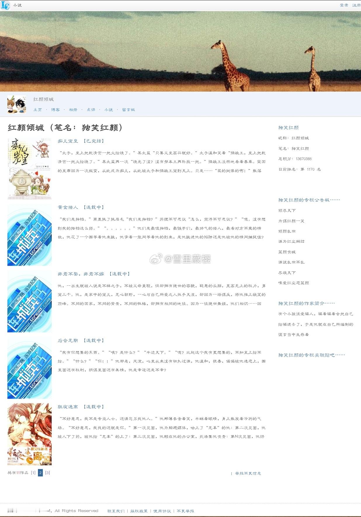 独笑红颜的《痴儿宠皇》,真的超喜欢这部小说,这段时间作为睡前读物又重温了,昨天找了很久才找到作者大大的其他小说,都没完结[苦涩]。