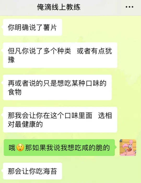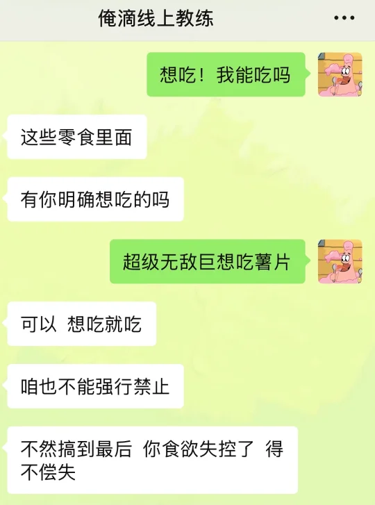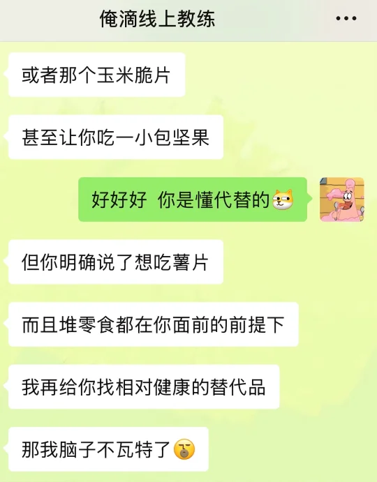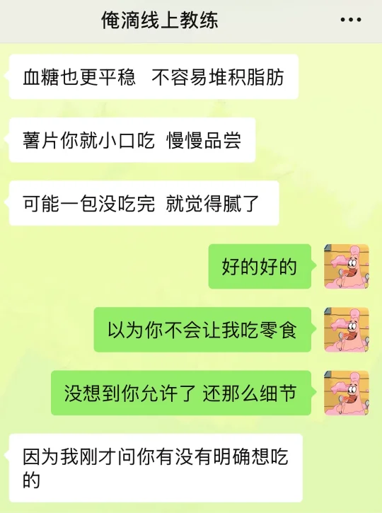 放假家里人买了两大包零食,可能是跟线上教练姐的食谱久了 该补充的营养都补充到了,所以我最近食欲还是相对稳定的 哪怕看到这么多零食,也没有到很馋的地步 不过薯片,我是真想吃一点 就去问了线上教练姐,本来以为她不会答应的 谁能想到,这姐好通透细节,直接把怎样搭配,吃多少,该注意什么全都给我讲了 喜欢这样的健身教练诶,懂尊重人的食欲,然后能很及时解决问题,给方法[赞R]