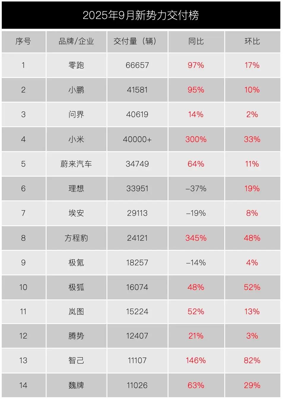 2025年“金九银十”传统销售旺季中,中国新能源汽车市场迎来排位大洗牌,新势力头部阵营月交付门槛已升至4万辆。 零跑汽车以6.67万辆的月交付量拔得头筹,同比增长近一倍,小鹏汽车也首次突破4万辆大关。小米汽车凭借超过4万辆的交付量首次跻身前列,显示出产能爬坡的成效。与此同时,问界凭借M9等高端车型在30万元以上市场站稳脚跟。传统车企方面,比亚迪继续领跑,9月销量近40万辆,其方程豹品牌同比暴涨超300%,吉利、长安等品牌新能源车销量也均创下历史新高。 我们可以发现,技术路线不再是壁垒,传统车企不再是看客,细分市场也不再是蓝海。 2025年最后一个季度,头部六强的排位还未固定,最终的赢家,必然是既能通过规模化控制成本,又能靠技术打造差异化体验,还能通过多产品线或多品牌战略覆盖细分市场的全能型选手。 当前竞争态势显示,增程技术普及化、传统豪华品牌反击以及800V快充等先进技术下沉至主流价位已成为关键趋势。未来,车企需在规模化成本控制、技术差异化及多品牌战略布局上综合发力,才能在日益激烈的市场中保持竞争力。#新能源汽车销量# #新能源车企销量#