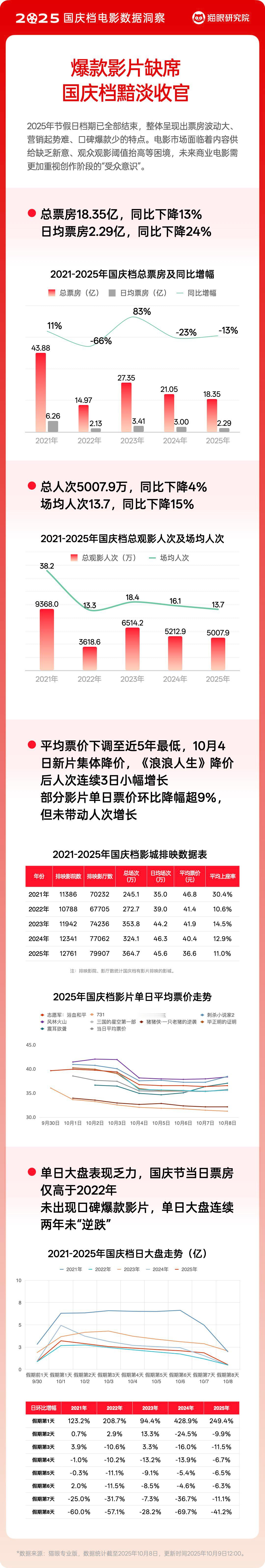 猫眼研究院发布2025国庆档数据洞察 数据显示,2025国庆档票房18.35亿,总观影人次5007万,平均票价36.6元为近五年最低。