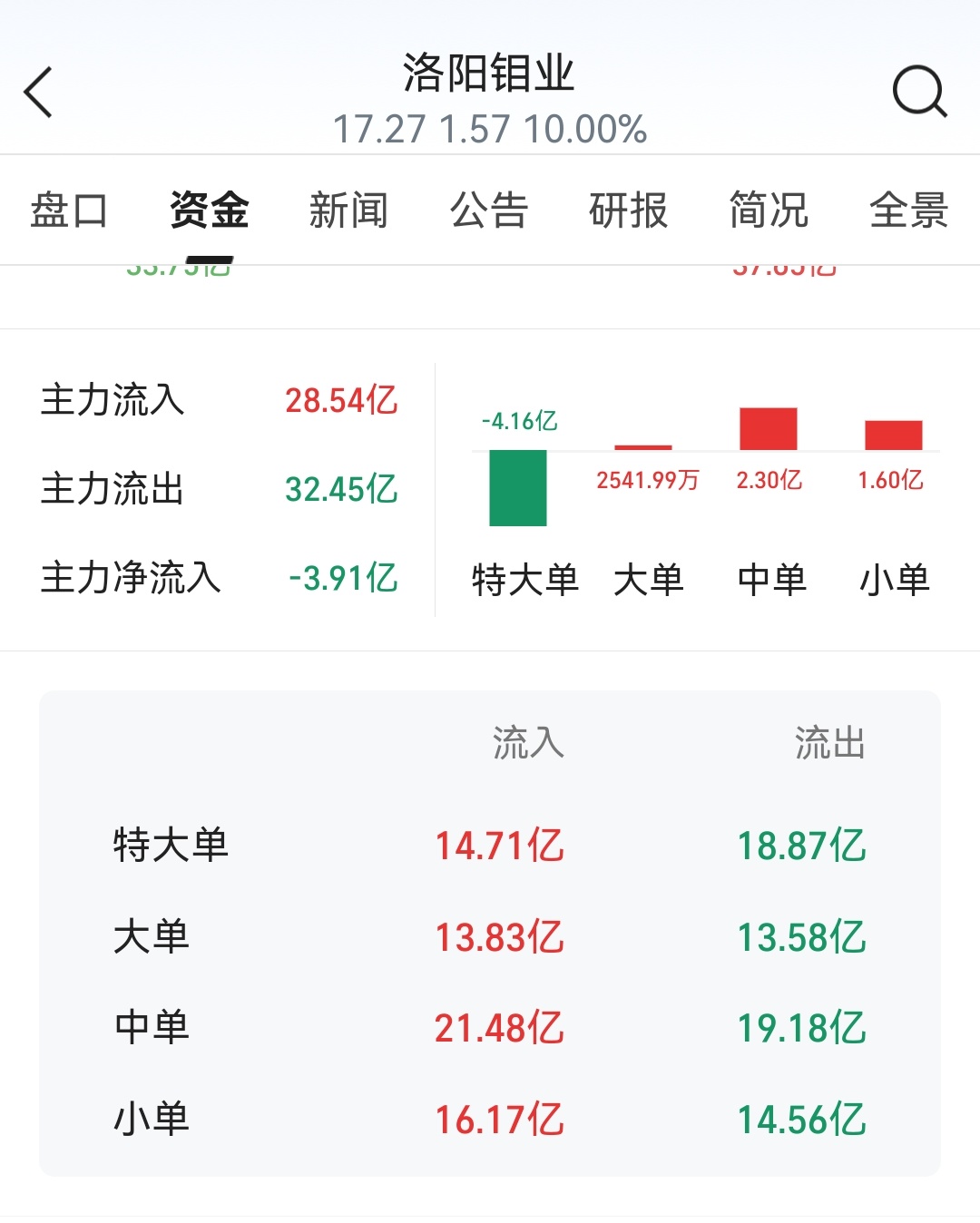 洛阳钼业今天涨停,但主力大单流出近4亿。它已经连续几根大红柱,我若在里面的话,明天乘拉高就会卖掉了。