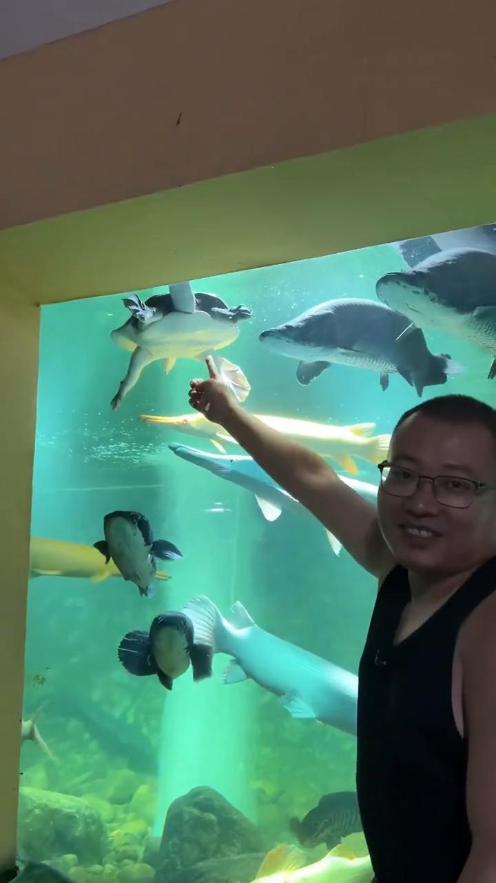 带大家见识一下全国最大的私人室外缸。 现在鱼缸透了,玻璃面到对面,六米长巨侧龟、白化火箭、花花火箭、招财猫、巨侧龟、铅笔、大老鳖、黄金河虎、酸菜鱼(黑鱼)、金目鲈、虎皮鸭嘴、法西亚虎鱼、地图龙鱼、花鳗、鲟鱼、锦鲤、刀疤鲲(嘎嘎)、红鱼,还有一个最出名的EM07。 最精彩的时刻要给鱼喂个食,今天准备了有个30斤左右。天气变凉了,盖板得盖上,这场面不常见吧?肉眼可见的这些鱼都长大了。接着龙虎缸,有位事全部都过来了,都过来了,还一喂食是吧?开始,喂食完毕,再见了各位。