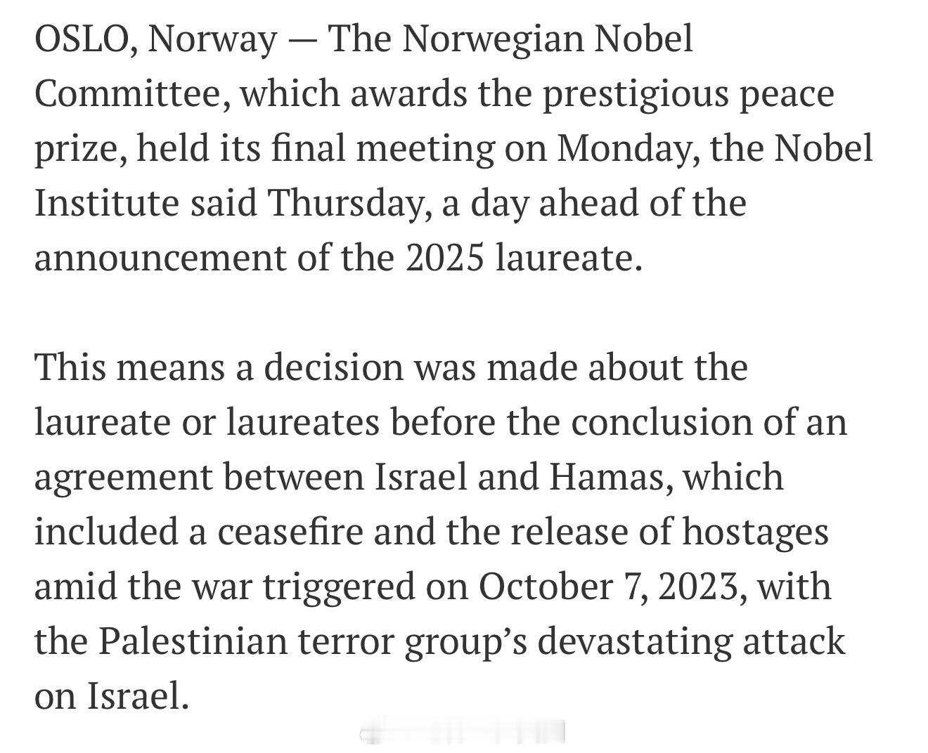 诺贝尔和平奖获奖者主已在周一、即在以色列和哈马斯达成协议之前被选出,专家表示今年川普100%没戏。[揣手]