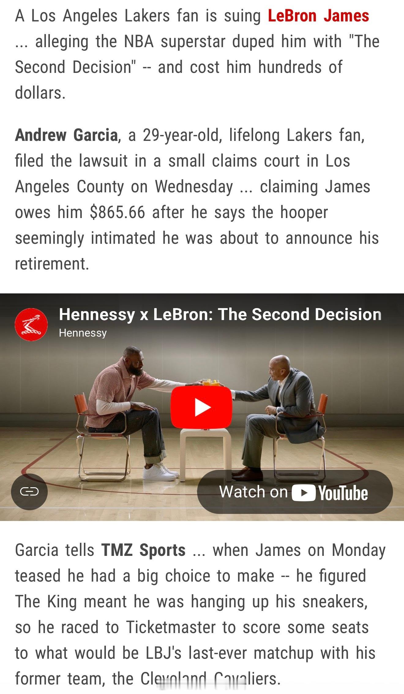 一名湖人球迷向詹姆斯提起诉讼,索赔 865.66 美元。他表示,自己原以为詹姆斯要宣布退役,于是买了两张湖人对骑士的比赛门票,但后来发现所谓的“决定2”其实只是一个广告,结果门票几乎变得一文不值。[二哈]