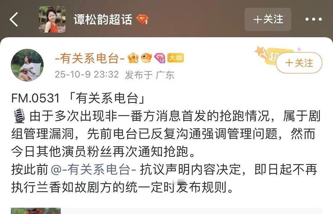昨晚郑合惠子对接和谭松韵对接都发了兰香如故物料通知,但是郑合惠子对接早于谭松韵对接发文。谭松韵方通知:今日其他非一番演员粉丝消息首发再次抢跑,即日起不再执行兰香如故剧方统一定时发布规则,们怎么看[皱眉] ​​​