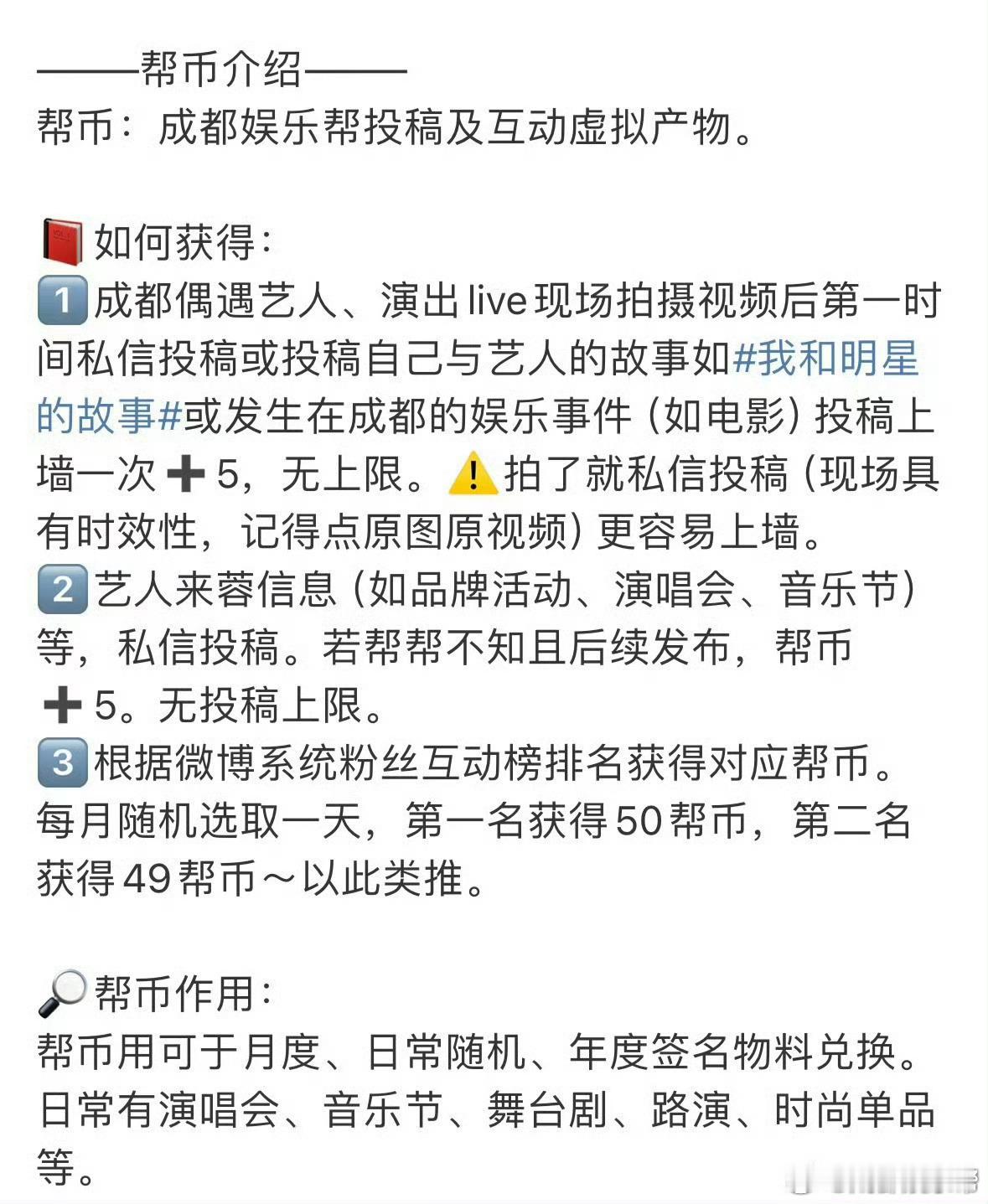 帮币用可于月度、日常随机、年度签名物料兑换。日常有演唱会、音乐节、舞台剧、路演、时尚单品等。