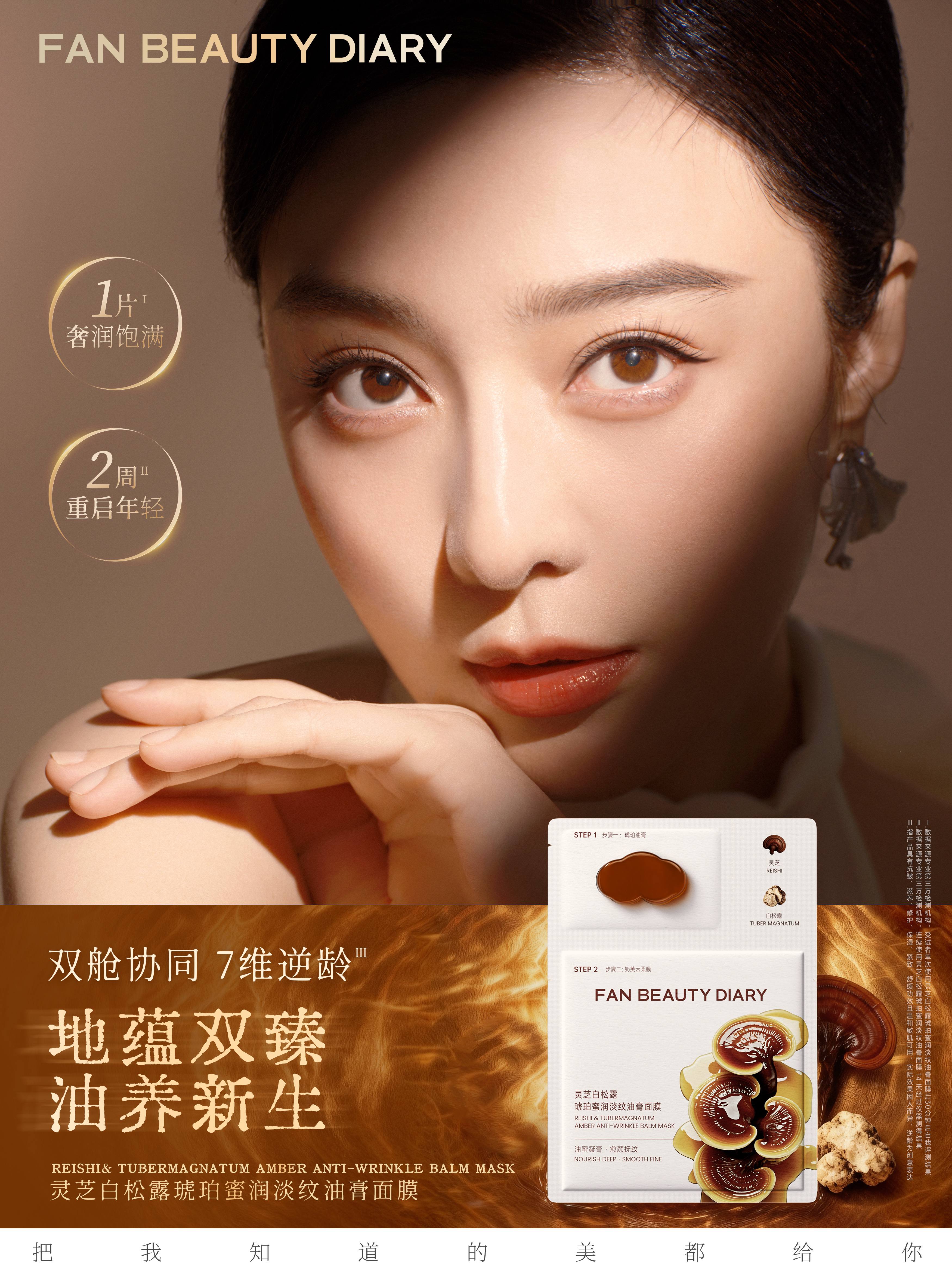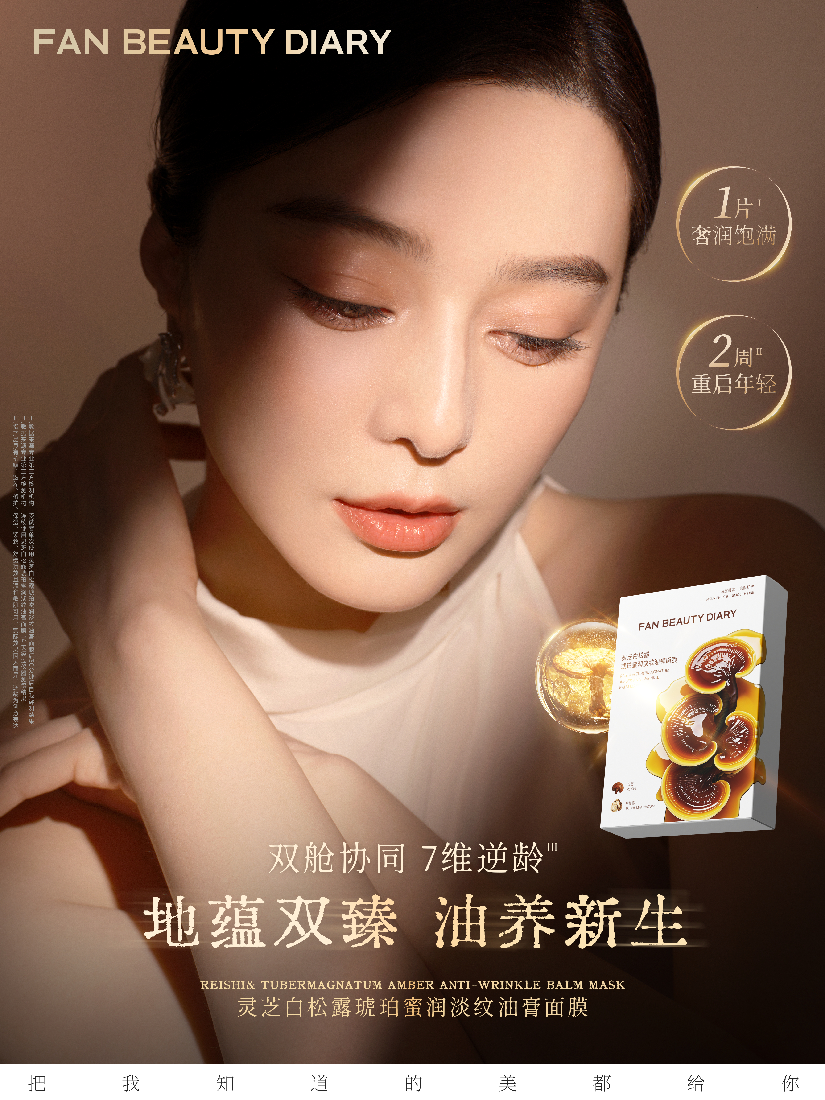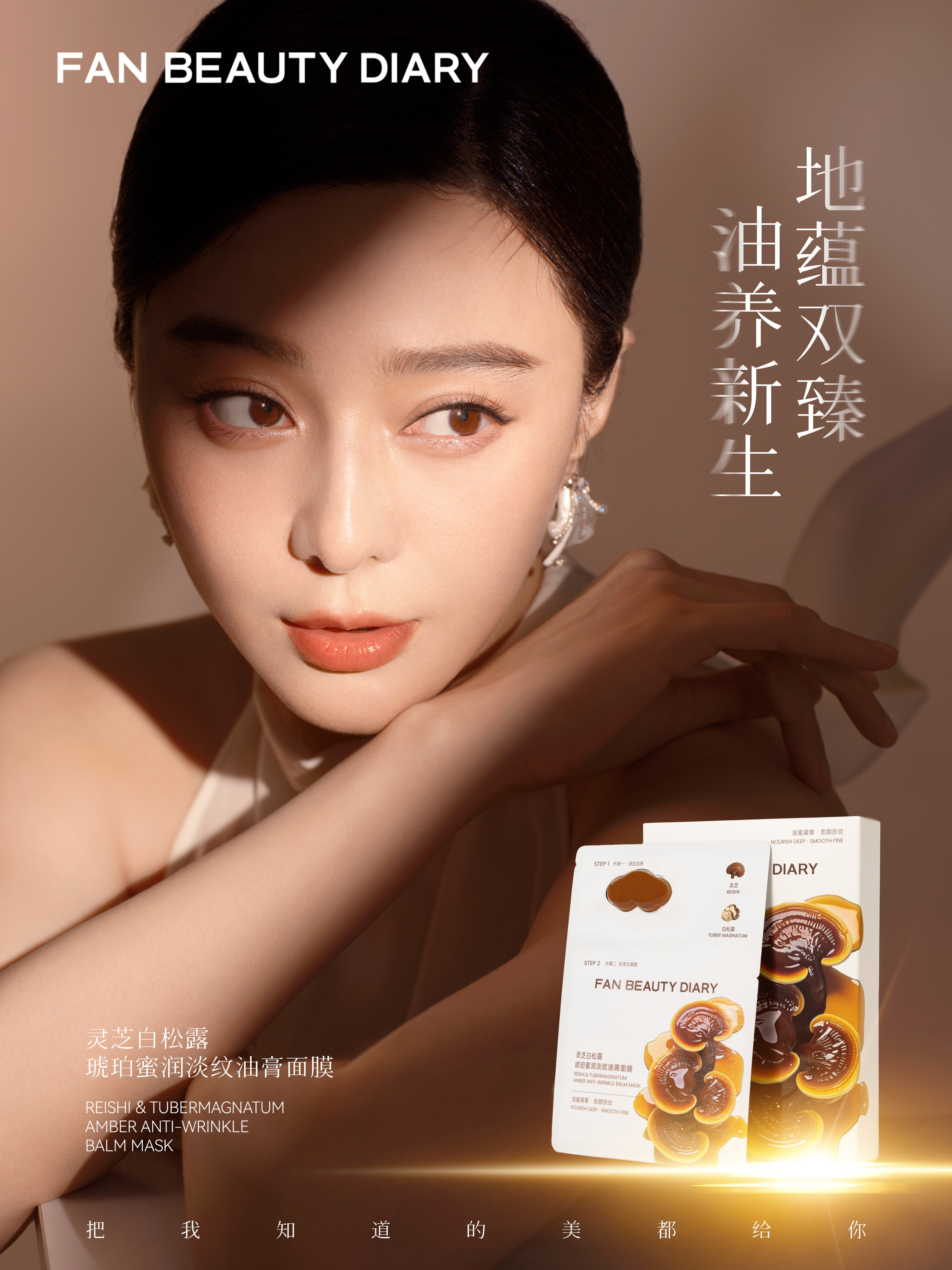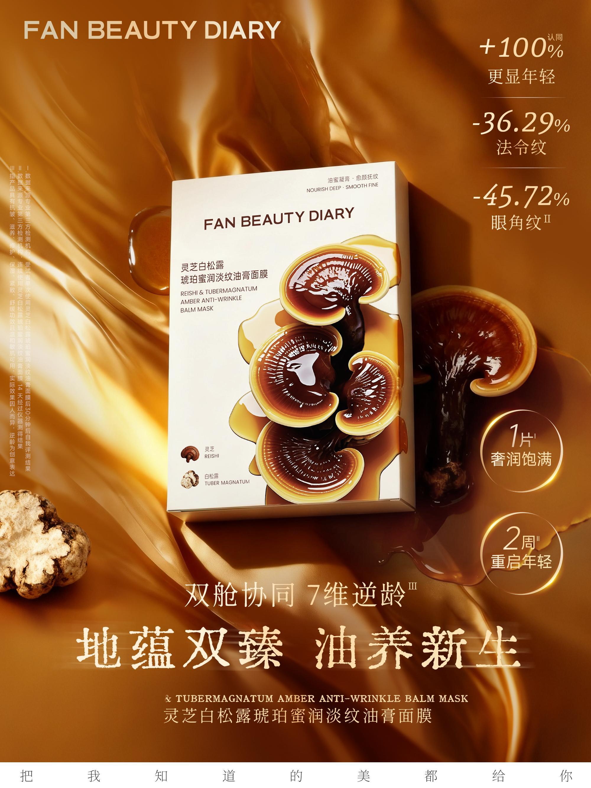范冰冰 x FAN BEAUTY DIARY 岁月侵袭,纹路松垮渐显,熟龄肌如何留驻年轻状态?「灵芝白松露琥珀蜜润淡纹油膏面膜」颠覆上市,以双舱精粹协同三相抗老体系,奢润滋养直抵肌底,唤醒胶原自生力,开启七维全面提升的逆龄新纪元。这个金秋,与一同以大地之母般的原始能量,开启奢润油养抗老新篇,逆龄紧塑,向上生长,让年轻,不止于表面。