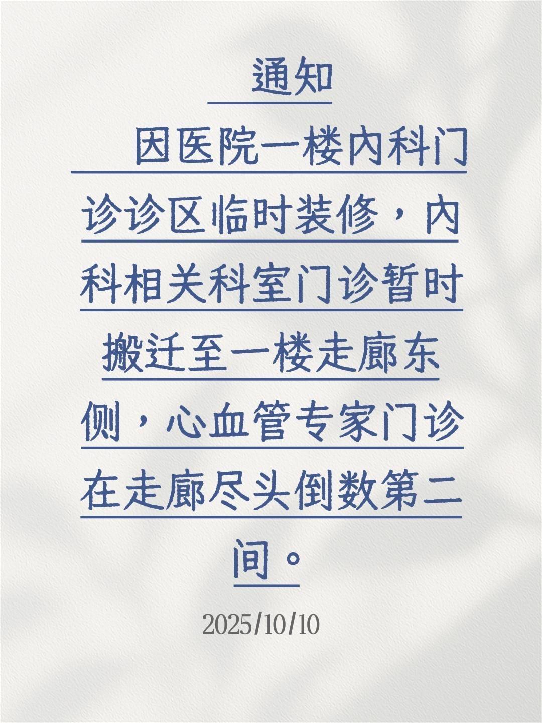 临时更改诊室。通知因医院一楼内科门诊诊区临时装修,内科...