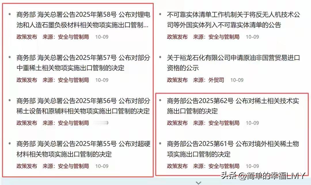 硬气!中国扔下“稀土核弹”,向全世界发起稀土管辖。 10月9日,商务部一天内连发6则公告,其中61号与62号公告如惊雷般炸响全球市场。这不是简单的政策延续,而是中国稀土管控的“史诗级升级”——首次将全产业链技术与境外衍生品纳入管辖,一记“核弹”级举措,彻底改写了全球稀土贸易的游戏规则。 此前的稀土管控多聚焦于资源本身,像是给战略资产加了层基础防护。这次截然不同,61号公告直接划出“微量红线”:境外制造的物项里,只要含有0.1%以上原产于中国的特定稀土金属或合金。 比如金属镝、铽、钐这些关键品种,或是用到了中国的稀土开采、冶炼、磁材制造技术,向第三国出口前必须拿到商务部的许可。0.1%是什么概念?大概是一粒米之于一筐稻谷的比例,如此低的门槛,等于堵死了所有规避管制的漏洞。 有人说这是“中国版长臂管辖”,可究其根本,这是对规则的精准运用。过去总有国家想耍小聪明,把中国稀土运到第三国加工转手,或是偷学技术搞本地化生产,以为这样就能绕开对华依赖。 现在这套行不通了,哪怕是洛克希德·马丁公司把含中国稀土的零部件运往英国工厂,都得先看中国的“脸色”。这招“釜底抽薪”,直接掐住了全球稀土产业链的命门。 62号公告则补上了更关键的一环——技术管制。稀土开采、冶炼分离、金属冶炼、磁材制造,连二次资源回收利用技术都被悉数纳入管控,这是国内首次把“技术管控”明确写入政策文件。 要知道,中国在稀土领域的话语权可不只靠资源,更靠硬实力:全球90%以上的精炼产能握在手里,70%以上的相关专利归中国所有,湿法冶金分离、钕铁硼磁体制造这些核心技术,比国外领先至少5到10年。 之前只控物项不控技术,就像给大门装了锁却没看住钥匙,现在“技术+供应链”双拳齐出,才算真正实现了管控闭环。 这波操作为啥能震动全球?看看美国的反应就知道了。 美国国防部数据摆着,各军种对中国关键矿物的平均依赖度高达77.7%。洛克希德·马丁公司之前就栽过跟头,因为稀土磁铁断供,F-35战机直接停产数周,这只是美国产业链脆弱性的一个缩影。 现在新规落地,从手机芯片、电动车电机到战斗机雷达,凡是沾了“中国稀土基因”的产品,都得在规则内运行。那些喊着“去中国化”的西方国家,突然发现自己站在了产业链的悬崖边。 美国不是没试过自救,砸了数十亿美元想重建本土稀土产业链,可谈何容易?稀土加工高污染、高能耗,美国本土的环保标准卡得极严,光建厂就得闯过层层关卡。 技术上更不用说,没有中国的专利授权和设备支持,提纯精度根本达不到高端制造的要求。成本更是天文数字,中国经过多年产业整合,早把加工成本压到了全球最低,美国想从零起步竞争,简直是痴人说梦。 短期之内,这三重枷锁根本无解。或许有人会问,中国这是要搞“单边胁迫”吗?看看历史就清楚了。2015年即便WTO裁定不利,中国还是主动取消了出口配额,转而靠产业整合、环保升级和内需拉动实现资源价值最大化。 这次新规里更是留足了情面,紧急医疗、自然灾害救助等人道主义用途能直接豁免,只是事后需要报备商务部,完全避免了“一刀切”的僵硬。中国从来没想过用稀土当武器,只是在维护自己的战略利益。 更关键的是,这次升级还有深刻的国内考量。新规既是对外反制,也是对内“清场”。之前总有不法分子钻空子,把磁材这类容易伪装的物项通过灰色渠道走私出境,或是偷偷转让核心技术牟利。 现在规则划得清清楚楚,哪些能做哪些不能做一目了然,等于给国内产业装上了“安全阀”,防止战略资产白白流失。这步棋,既守住了国门,也净化了行业生态。 有意思的是,新规还特别提到了半导体和人工智能领域的审批细则:最终用途是研发14纳米及以下逻辑芯片、256层及以上存储芯片,或是有潜在军事用途的人工智能相关物项,都要逐案审批。 这等于精准瞄准了高端制造的核心领域,既保障了自身技术安全,也向外界释放了明确信号:中国的管控有章可循,不是盲目收紧,而是精准施策。 从“资源防御”到“能力管控”,中国稀土政策的升级,本质上是全球产业链话语权的重新洗牌。 过去西方靠技术优势制定规则,现在中国用自身实力改写规则。这不是霸权,而是对“谁付出谁受益”原则的捍卫——中国承担了全球稀土加工的环境成本,掌握了核心技术,自然有权利制定贸易规则。那些习惯了“搭便车”的国家,是时候清醒了。 新规落地,中美围绕稀土与半导体的博弈只会更深化,但主动权已悄悄转移。中国用“技术+规则”双轮驱动,既回应了外部挑衅,也夯实了自身根基。全球稀土战局,已然进入“中国规则时间”。 而对其他国家来说,与其怨天尤人,不如早点适应新规则——毕竟在全球化的今天,合作共赢才是唯一的出路,逆潮流而动,最终只会搬起石头砸自己的脚。