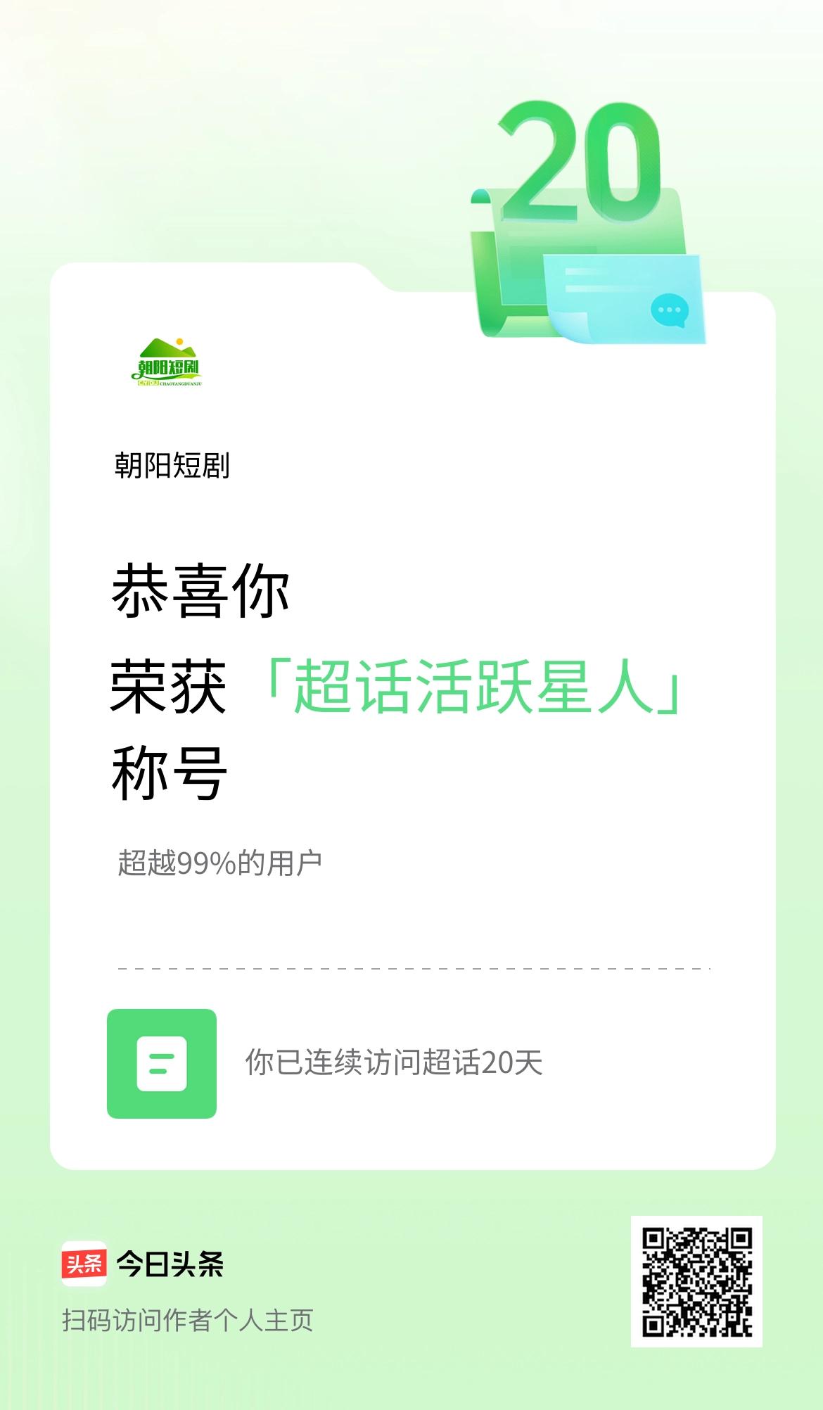 我在头条连续访问超话20天,获得“超话活跃星人“称号,你也快来超话看看吧~