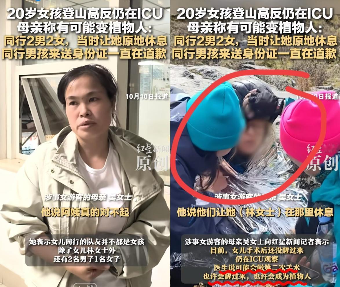 20岁女孩登山高反, 仍在ICU 母亲称有可能变植物人。 她表示女儿同行的队友,除了女儿林女士外还有2名男子一名女子。当时让她原地休息 ,同行男孩来送身份证一直在道歉, 男孩一直在叹气说:阿姨真的对不起,我也一直在担心她,从2号到现在一直没有睡觉,我们没有把她扔在山上,我们只是让她原地休息,我们就先下来了。 我想他们肯定没想到会是这样的结果,他们只是高估了女孩的身体素质,发生这样的事他们也很难过。 但话说回来,他们当时就算不能把林女士带下来,为啥不报警求助呢,或许早一点救下来就不会这么严重。
