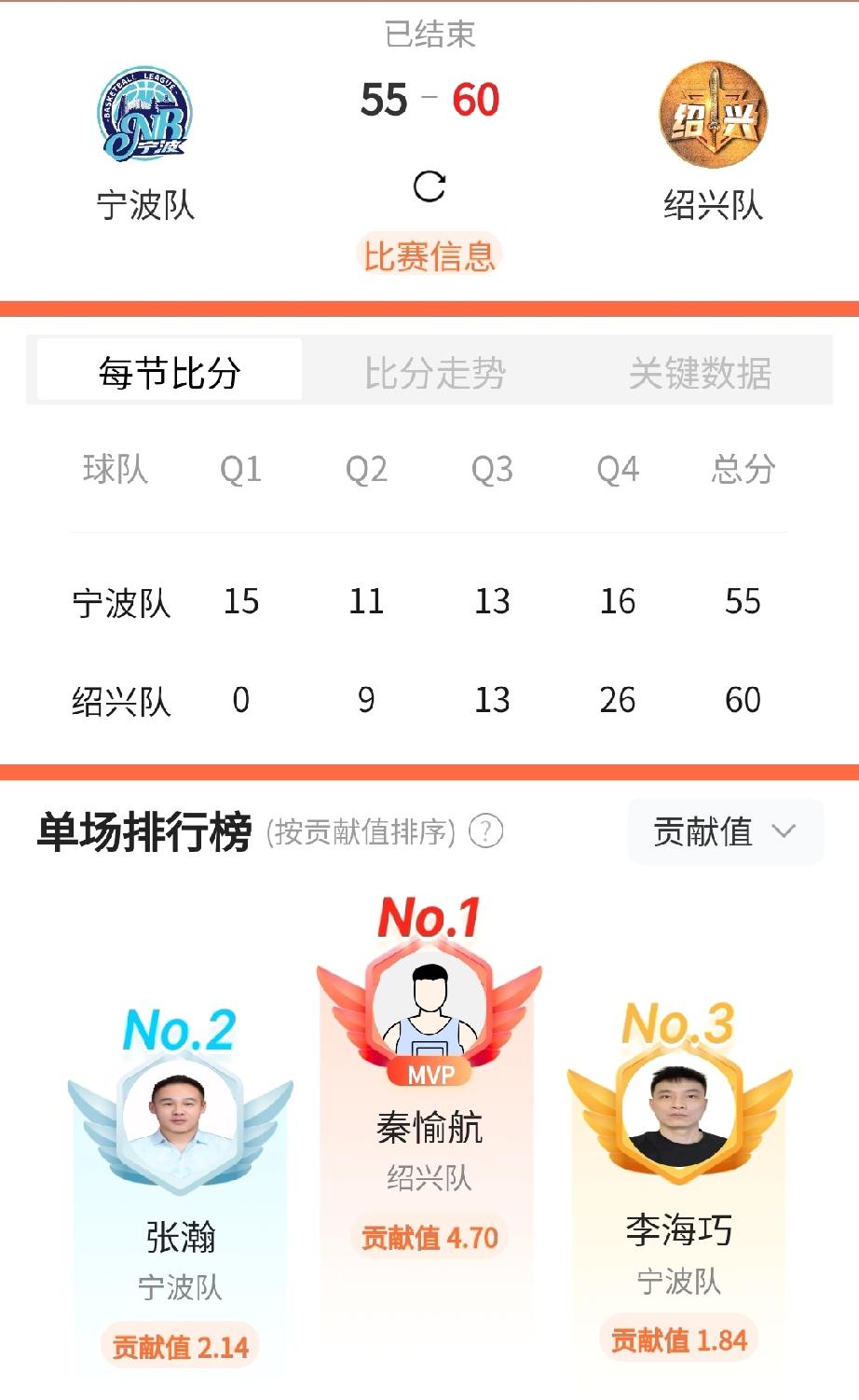 以己之弱攻彼之更弱!绍兴今天做到了孙子兵法之大术! 宁波与绍兴今天的上半场大家看了比赛没,简直是灾难级别的表现!绍兴今天半场拿了21分,宁波拿了26分,真是半斤八两!上半场的表现直接打走一半观众,剩下一半观众就想看看下半场还能不能继续打铁了? 没走的观众有福了,今天绍兴队的秦榆航不愧是穿24号的男人,天神下凡!如果要说转折点是从哪颗球开始?就是绍兴吴成昊受伤下场,他的两颗罚球让秦上来罚以后,秦就直接一发不可收拾!全场比赛狂轰27分7板4助4断,直接打服宁波后卫线,不对,宁波没有后卫!今天没有他,绍兴稳输了,赛前猛吹的大内线吴成昊6分4板被打成路人! 宁波队教练也大有问题,被绍兴打出一波小高潮的时候,还让三个大内线在场上,比分就这样被反超,被拉开!还在场边气急败坏,毫无作为!这场绍兴赢了以后,前四的地位又更稳固了一点,同时两支球队也发现了自己的不足,就是后卫线无人可用!抓住中期换人的契机,继续补强吧!浙BA 绍兴队