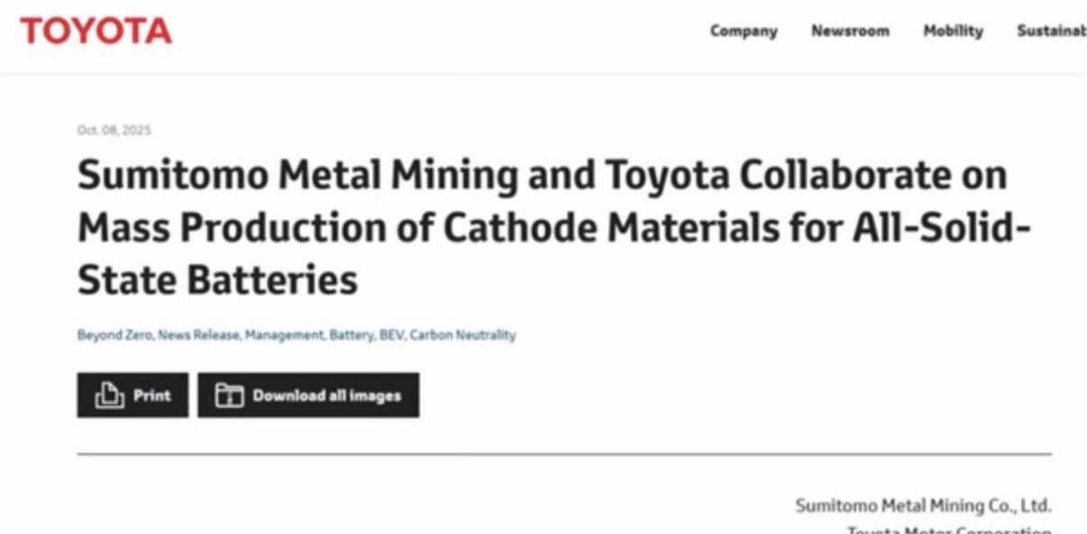 10月10日消息,近日,丰田汽车通过全球官网宣布,已与住友金属矿山株式会社达成合作协议——双方将围绕纯电动汽车(BEV)用全固态电池正极材料的量产展开协作。