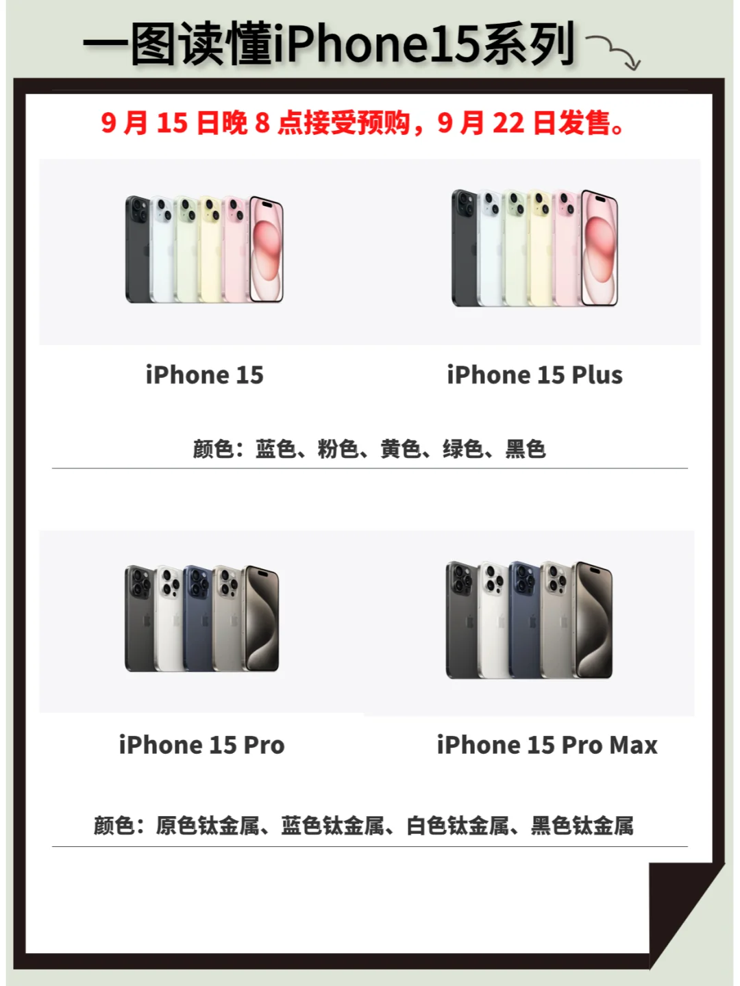 苹果iPone15全系列终于发布了,配置及价格对比如上 🌈抢购准备:订购将于 9 月 15 日(周五)开启,9 月 22 日(周五)起正式发售 ✅iPhone 15 和 iPhone 15 Plus 1、采用融色玻璃背板,铝金属外边框采用全新设计的弧形边沿 2、两款机型均包括灵动岛 3、4800 万像素主摄支持拍摄超高像素分辨率照片,新增 2 倍长焦选项,提供总计 3 档光学变焦 4、iPhone 15 系列还提供新一代人像功能,能够更轻松地拍摄出细节丰富的人像照片,弱光环境下的摄影表现也得到提升 5、搭载 A16 仿生芯片 6、新增 USB-C 端口 7、Phone 15 和 iPhone 15 Plus 将提供五种配色:粉色、黄色、绿色、蓝色和黑色。 ✅iPhone 15 Pro 和 iPhone 15 Pro Max 1、采用质地坚固和轻盈的航空级钛金属打造(有史以来最轻的Pro机型) 2、全新设计还采用弧形边沿,静音按键 3、更先进的 4800 万像素主摄,支持全新的 2400 万像素超高默认分辨率 4、新一代人像功能带来焦点和景深控制 5、对夜间模式和智能 HDR 的提升 6、一个 iPhone 15 Pro Max 专属全新 5 倍长焦摄像头 7、搭载 A17 Pro 处理器 8、全新 USB-C 端口得到 USB 3 速度的加持,与 USB 2 相比传输速度可提升 20 倍之多 9、iPhone 15 Pro 和 iPhone 15 Pro Max 将推出 4 种配色,:黑色钛金属、白色钛金属、蓝色钛金属和原色钛金属。 ✨欢迎评论区提出你的任何选购困惑