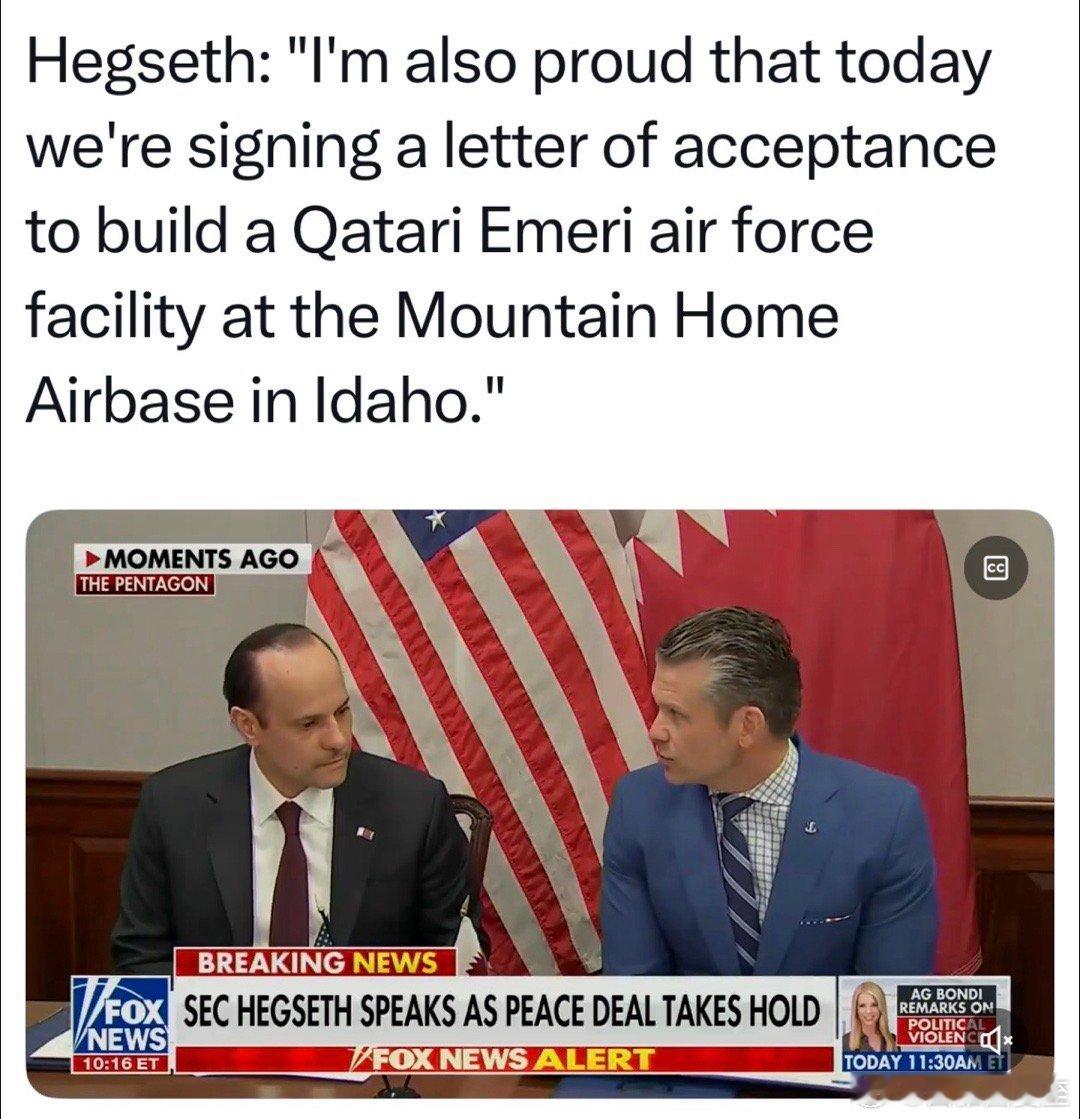 国防部长宣布:今天签协议,在美国Idaho州,修建卡塔尔空军基地