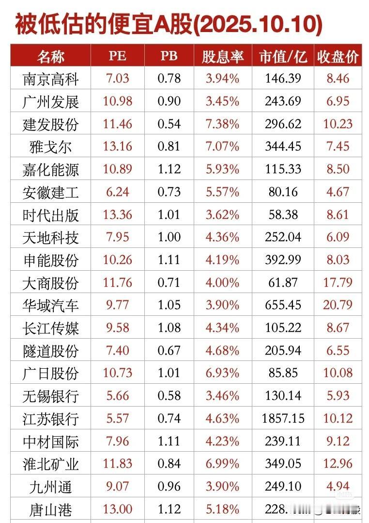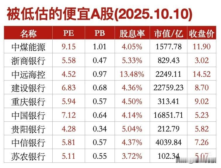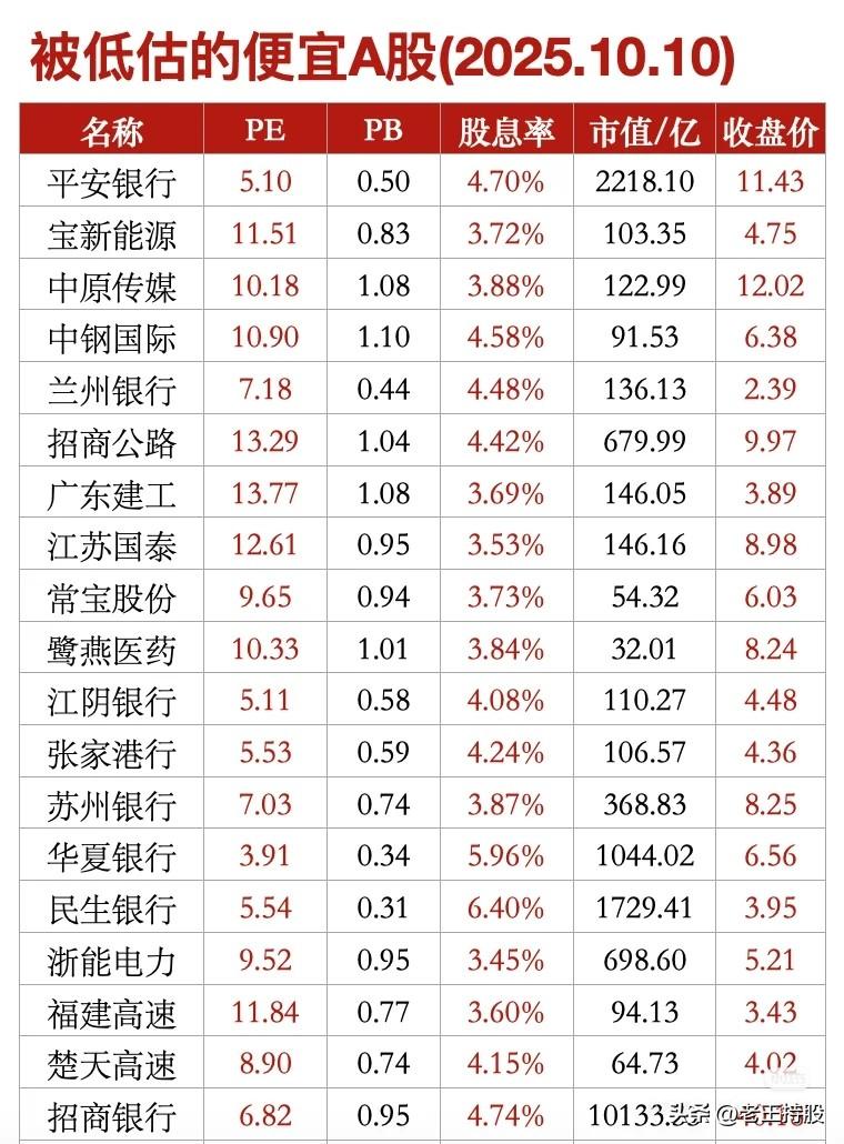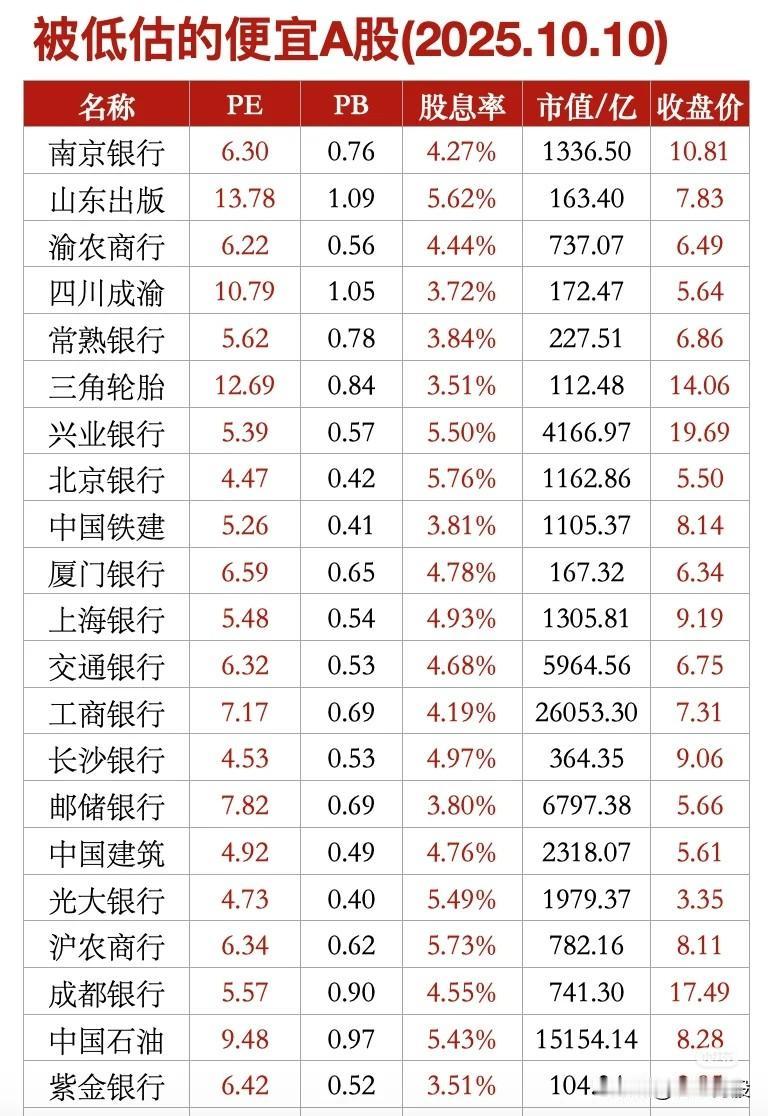 “被低估的便宜A股(2025.10.10)”相关股票筛选列表,主要展示了多只A股上市公司在市盈率(PE)、市净率(PB)、股息率、总市值(亿元)和收盘价(元)等关键估值指标上的表现。这些股票普遍具有如下特征: 一、整体特点 - 低估值: - 多数股票的PE(市盈率)在3~14之间,不少低于10,比如: - 民生银行 PE = 5.54 - 华夏银行 PE = 3.91 - 中远海控 PE = 4.52 - 建设银行 PE = 6.83 - 工商银行 PE = 7.17 - 重庆银行 PE = 5.94 - 光大银行 PE = 4.73 - 平安银行 PE = 5.10 - 江阴银行 PE = 5.11 - 沪农商行 PE = 6.34 - PB(市净率)普遍偏低,很多在0.3~1之间,例如: - 民生银行 PB = 0.31 - 华夏银行 PB = 0.34 - 光大银行 PB = 0.40 - 渝农商行 PB = 0.56 - 浙商银行 PB = 0.47 - 苏农银行 PB = 0.55 - 贵阳银行 PB = 0.34 - 中远海控 PB = 0.97 - 厦门银行 PB = 0.65 - 上海银行 PB = 0.54 - 高股息率: - 很多股票的股息率超过4%,甚至高达6%~13%+,例如: - 中远海控 股息率 = 13.48% (为所有股票中最高) - 民生银行 股息率 = 6.40% - 华夏银行 股息率 = 5.96% - 建设银行 股息率 = 4.36% - 交通银行 股息率 = 4.68% - 北京银行 股息率 = 5.76% - 中国银行 股息率 = 4.14% - 重庆银行 股息率 = 4.50% - 江苏银行 股息率 = 4.63% - 工商银行 股息率 = 4.19% - 冀东水泥等其它也普遍在3.4%~4.7%区间 - 市值分布广泛: - 既有市值超万亿的巨头,如: - 工商银行(26053.30亿) - 建设银行(22759.23亿) - 招商银行(10133.33亿) - 中国银行(16851.71亿) - 也有中小市值公司,如: - 贵阳银行(212.79亿) - 苏农银行(102.34亿) - 紫金银行(104.34亿) - 三角轮胎(112.48亿) - 常宝股份(54.32亿) - 湖南投资等市值在百亿上下 - 行业分布广泛: - 涵盖银行(如平安银行、招商银行、民生银行、华夏银行、工商银行、建设银行等) - 能源(如中国石油、中煤能源、淮北矿业) - 交通运输(如招商公路、四川成渝、重庆银行、中远海控) - 建筑地产(如中国建筑、建发股份、中国铁建) - 传媒出版(如中原传媒、山东出版、长江传媒) - 电力(如浙能电力、申能股份) - 零售/汽车/制造(如华域汽车、江苏国泰、常宝股份、三角轮胎) - 地方银行(如南京银行、上海银行、厦门银行、渝农商行、长沙银行、贵阳银行、苏州银行、江阴银行、张家港行、无锡银行等)