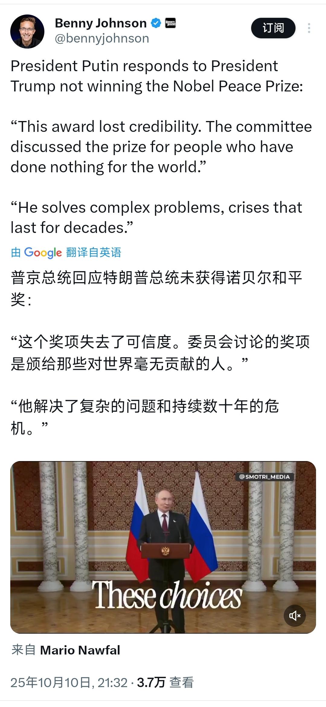 俄罗斯总统普京10月10日回应特朗普未获得诺贝尔和平奖:“这个奖项失去了可信度。委员会讨论的奖项是颁给那些对世界毫无贡献的人。”“他解决了复杂的问题和持续数十年的危机。” 我只想说普京这番回应,可谓一针见血又暗藏深意!诺贝尔和平奖没颁给特朗普,普京在北京时间 10 月 10 日晚第一时间就站出来为他鸣不平,直言这个奖项 “失去了可信度”,还明确肯定特朗普 “解决复杂问题与持续数十年危机” 的能力,这话里的分量可真不轻。 大家得先弄明白,普京肯定的 “贡献” 不是空口说白话。特朗普这阵子确实在和平事务上动作频频,美东时间 10 月 8 日,他还在社交平台发文说,巴以双方已经签署了他提出的 “20 点计划” 第一阶段协议,所有被扣押人员很快能获释,以色列军队也会撤到商定界线。 要知道这轮巴以冲突都满两周年了,能推动停火可不是件容易事,连以色列总理内塔尼亚胡都发文说 “特朗普当之无愧拿诺贝尔和平奖”,还特意用 AI 做了张给他颁奖的照片。 更别说特朗普自己都说,他已经平息了七场国际冲突,还在推进俄乌冲突的解决,这些都不是随口编造的事儿。 普京说诺贝尔和平奖 “失去可信度”,这话也确实戳中了不少人的想法。这个奖项本来是表彰真正促进和平的人,可这些年争议越来越多。 2009 年奥巴马刚上任九个月,没做什么实际和平工作就拿了奖,当时连《华盛顿邮报》都觉得不可思议。1973 年基辛格因为越南停火获奖,结果协议很快就破裂了,被人嘲讽是 “战争奖”。 这次更离谱,特朗普有推动巴以停火的实际成果,还有以色列、巴基斯坦政府等多个方面提名他,可委员会还是绕开了他,选了更符合西方叙事的人,这不难怪让人质疑公平性吗?挪威有律师就说,委员会太偏向欧洲中心主义,根本忽视特朗普这种 “实力外交” 带来的实际和平。 再往深了想,普京这表态里藏着的政治门道更值得琢磨。这阵子俄美关系本来就挺紧张,特朗普之前还把俄罗斯称作 “纸老虎”,普京当时回应说就算是 “纸老虎” 也不好对付,但还是强调恢复与美国的全面关系符合俄罗斯利益。 现在特朗普在推动俄乌和谈上有动作,普京立马站出来认可他的和平贡献,这明摆着是释放善意。毕竟俄罗斯总统助理之前就说过支持给特朗普颁奖,现在普京亲自表态,等于是把缓和关系的信号摆到了台面上。 而且特朗普要是真能在俄乌、中东这些问题上持续发力,俄美之间就有了更多对话的空间,这对两国关系改善肯定有好处。 不过这里面也有小波折,特朗普之前还说在考虑给乌克兰提供 “战斧” 导弹,普京当时就警告说这会让局势升级,破坏两国关系中的积极因素。 但即便如此,俄罗斯还是愿意向美国提供核电用铀,美国也没敢轻易祭出制裁大棒,说明两国都不想彻底把关系搞僵。这次普京为特朗普鸣不平,说不定能让这种微妙的平衡往好的方向走,毕竟佩斯科夫之前就说了,普京对特朗普的会晤邀约还 “仍然有效” 呢。 我觉得,普京这话说得既有道理又有策略。诺贝尔和平奖要是总盯着 “政治正确”,忽视实际的和平成果,早晚得彻底失去人心。而普京借这个机会既肯定了特朗普,又给俄美关系留了余地,确实是高招。 大家怎么看呢?你觉得特朗普推动巴以停火的功劳够得上诺贝尔和平奖吗?普京这波表态真能让俄美关系缓和下来吗?欢迎在评论区聊聊你的想法!