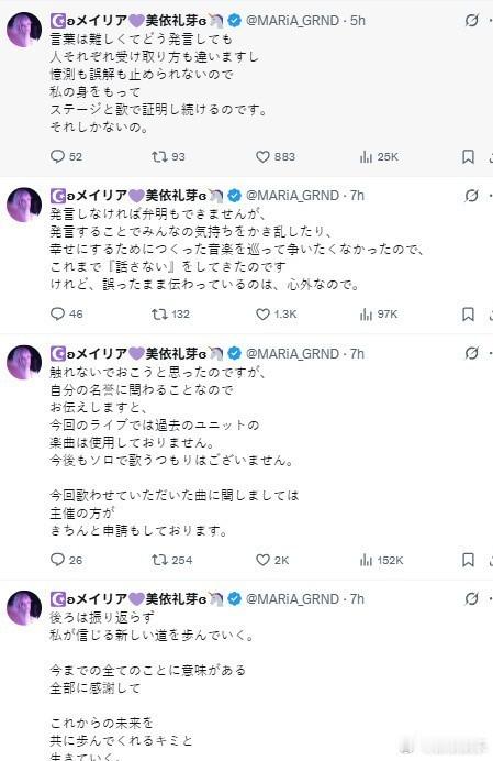 美依礼芽将不再演唱极乐净土等歌曲 日本歌手美依礼芽10日发推称,《极乐净土》《桃源恋歌》等GARNiDELiA时期歌曲,个人名义下将不再演唱,或涉版权问题。