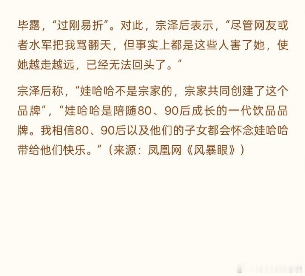 宗泽后回应宗馥莉辞职一边是宗馥莉砍掉旧渠道、推新品牌的激进改革,一边是老辈认可的“人情根基”;而那句“娃哈哈是员工与消费者共建的品牌”,更让这场家族企业传承之争,多了层关于品牌归属的集体记忆讨论。你觉得宗馥莉的辞职,真的是“水军之过”吗?