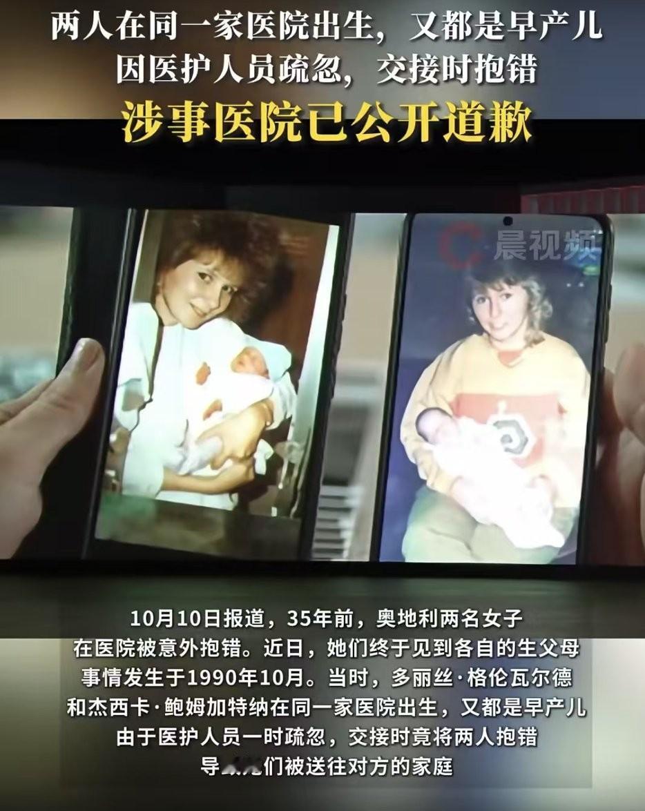 同样是抱错,奥地利这两家孩子找回来后就太过于幸福了,平白无故多了一家亲戚,而不是突然冒出一家仇敌。 归其原因,抱错新生儿的出错方只有医院,两家大人没有参与,他们都算被动养育别人孩子。 完全是医护人员的疏忽,将两个同日出生的早产儿给错了产妇。 第二,两个孩子都很健康,活到35岁,未发现有遗传病,不需要捐赠器官。 第三,抱错的事是孩子们先发现的,她们有更早的心理建设。 先是一家女儿在2012年献血发现血型不对劲,DNA检测证实了她的想法。然后她开始通过媒体报道了此事,公开寻找亲生父母。 几年后另一家女儿也因为怀孕意外发现自己血型与父母不符,认为自己就是掉包婴儿的之一。 于是两家人联系后彼此相认,其乐融融。 还有就是院方很痛快地承认是自己管理疏忽,是他们的责任。 原报道也没提俩家人找医院索赔。 整个事件每一帧都是岁月静好,虽然两位女主的人生也都改变了,但结局是好的。