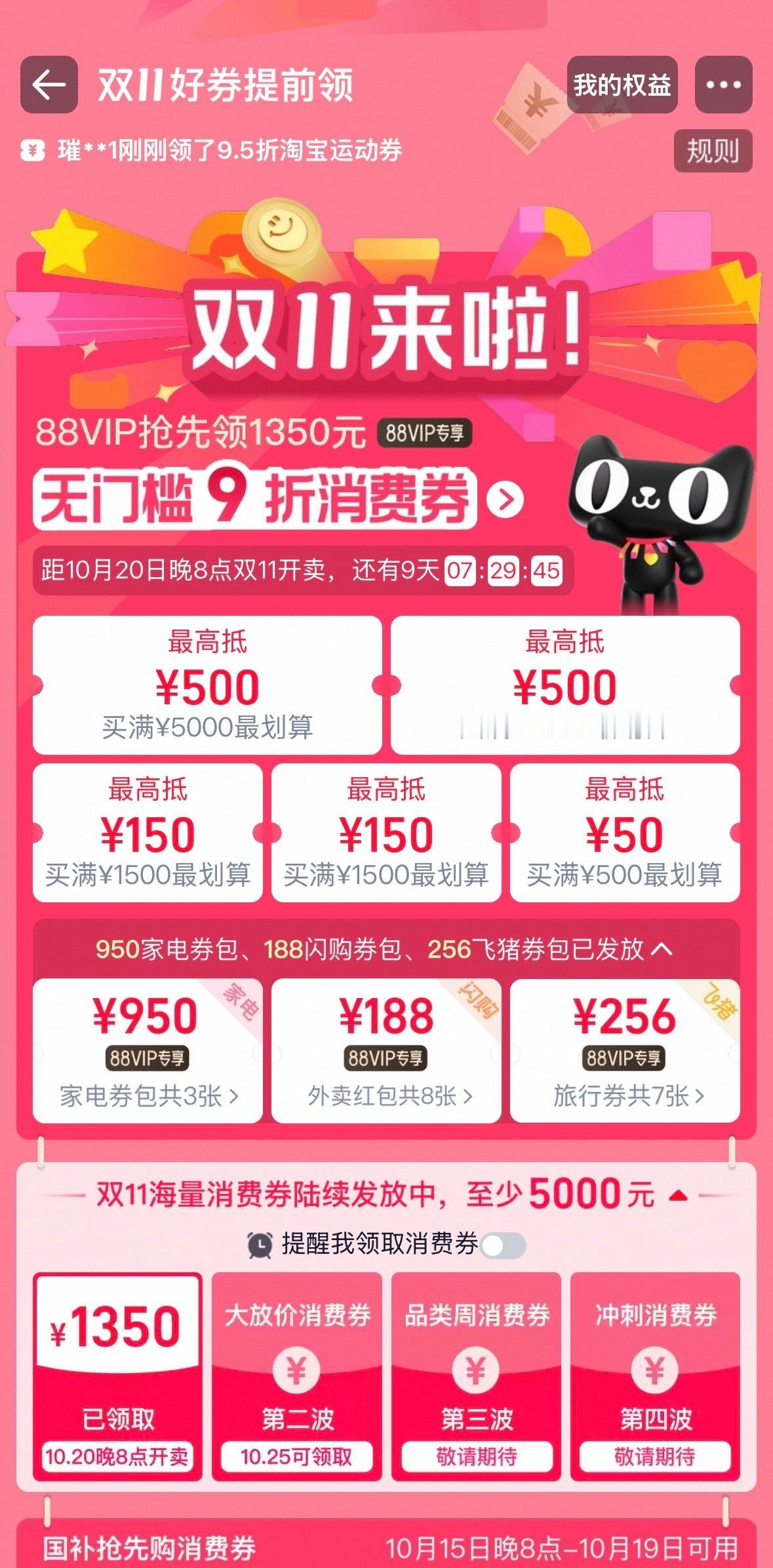 今天一睁眼,就看到做电商的朋友在传——史上补贴力度最大的双11要开始了……说实话,我一开始也没太在意,毕竟双11家家都有,年年都办。虽然家里囤的洗发水、沐浴露这些消耗品快要见底,种草的各地特色零食也在购物车里蠢蠢欲动,但是作为一个习惯先研究规则再下单的省门信徒,我还是仔细研究了一番。发现天猫双11今年的优势确实明显,首先是优惠简单直接,88VIP无门槛9折消费券今天就能直接领了,几乎所有我想买的产品都可以用上!多张9折消费券,3套11张,面额高达3250元,简直是史上最大的卷包...对于我们这种就想实实在在省点钱的人来说,这种没什么套路的优惠可得好好抓住! 现在上淘宝搜【88VIP领券】,就可以领券啦,速冲哇朋友们天猫双11今天就补3250元天猫双11才是真优惠天猫双11