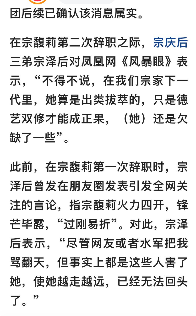 宗馥莉辞职,其叔叔宗泽后又一次发声 宗馥莉辞击公司法定代表人、董事及董事长等全部职务,其叔叔宗泽后再次发声,他先是夸奖了侄女,他说在他们宗家下一代里,侄女宗馥莉算是出类拔萃的;接下来他又指出侄女的欠缺之处,他表示只是德艺双修才能成正果,(她)还是欠缺了一些 有网友表示从其叔宗泽后第一次评价到现在的结果看来,他的评价还是挺中肯的,这个叔叔看得清看得远看得透!!! 还有网友表示这个叔叔不断指责小宗就是最没有德!即便这样,小宗没有说叔叔一个不字。到底谁没有德 也有网友表示他叔叔不断的跳出来攻击宗馥莉,就可以看出他们的家庭情况非常复杂,宗馥莉太难了,在那样复杂的家庭环境中,还要承受外面的各种舆论,自己的亲人都要攻击她,宗馥莉辞职是无奈之举,也是明智之举,必须把各种藤蔓斩断 宗馥莉辞去娃哈哈董事长、总经理职务未必就是一件坏事,激流勇退,明智之举。接班后创下产值利润新高,有发展思路和愿景,得以证明自己能力足矣。明晰产权和资金的遗留问题,让杜及吃瓜者带着遗憾,眼睁睁的看着小宗挥挥手,不带走任何遗憾,另辟蹊径。高手!凭她自己的能力和人脉,重新打下一片事业来也不是啥难事,但愿她能取得成功,光大娃小宗,做一个德艺双修的企业家。